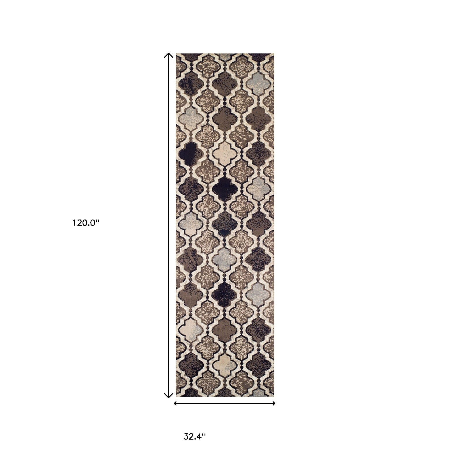 10' Ivory Quatrefoil Power Loom Distressed Stain Resistant Runner Rug