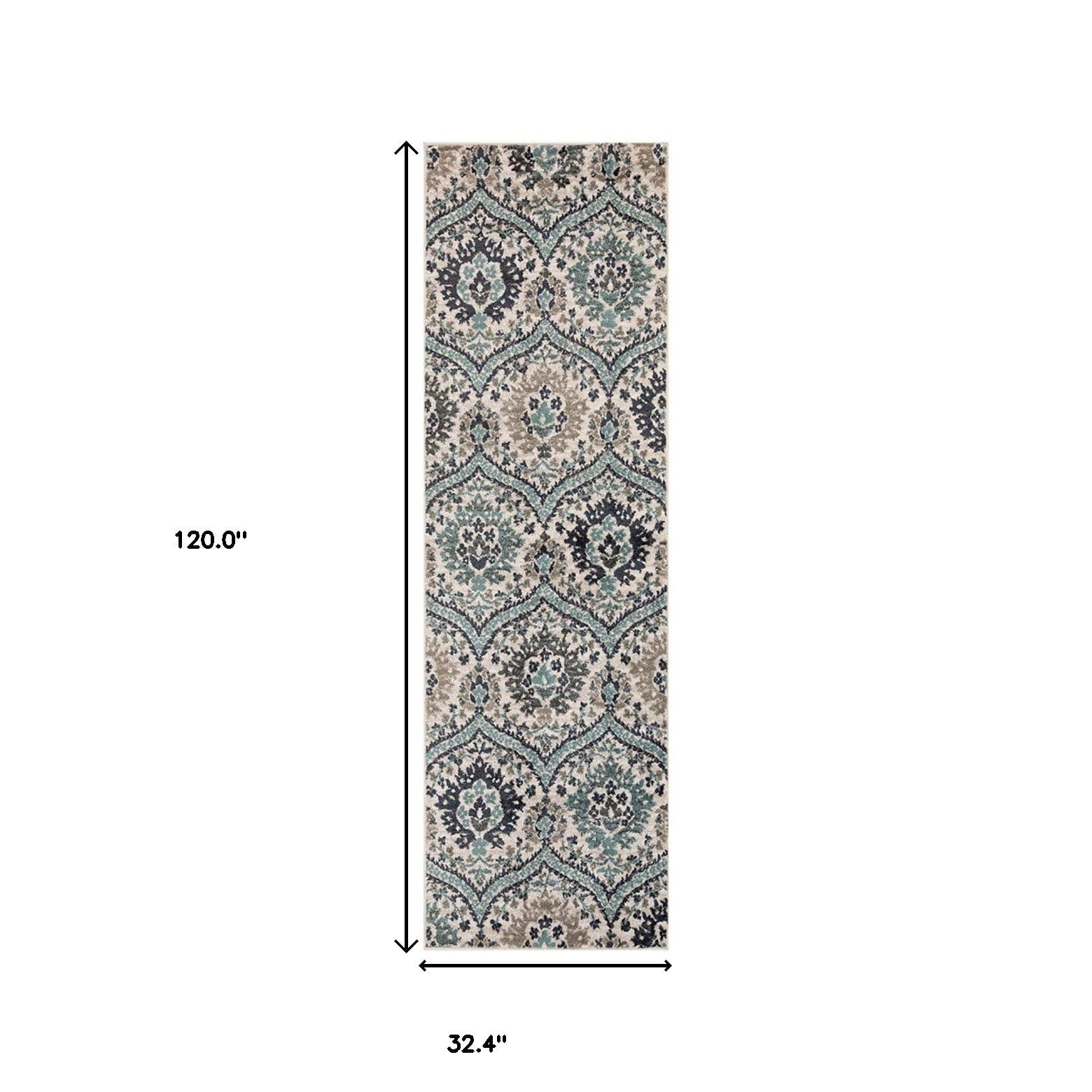 10' Runner Ivory Blue And Gray Floral Stain Resistant Runner Rug
