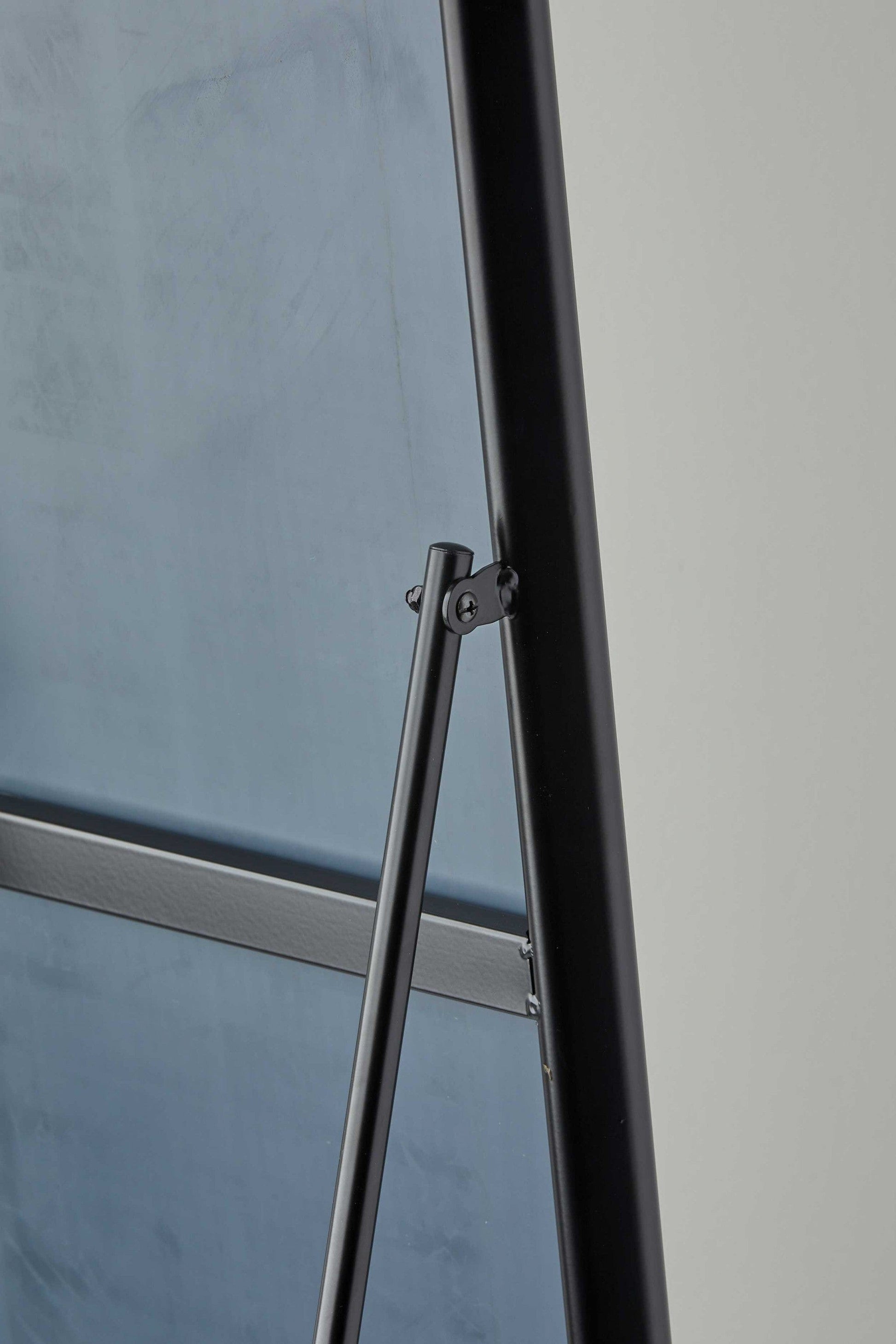 Enhance your bedroom or living room with this Standing Floor Mirror. With a 13" width and a 14" depth, this mirror is perfect for small spaces. A matte black frame is accented with a natural wood finish on each end, adding mid-century modern flare to this simple, functional item. This mirror requires little to no assembly. Simply open the box, un-fold the frame and set it up where it is needed.