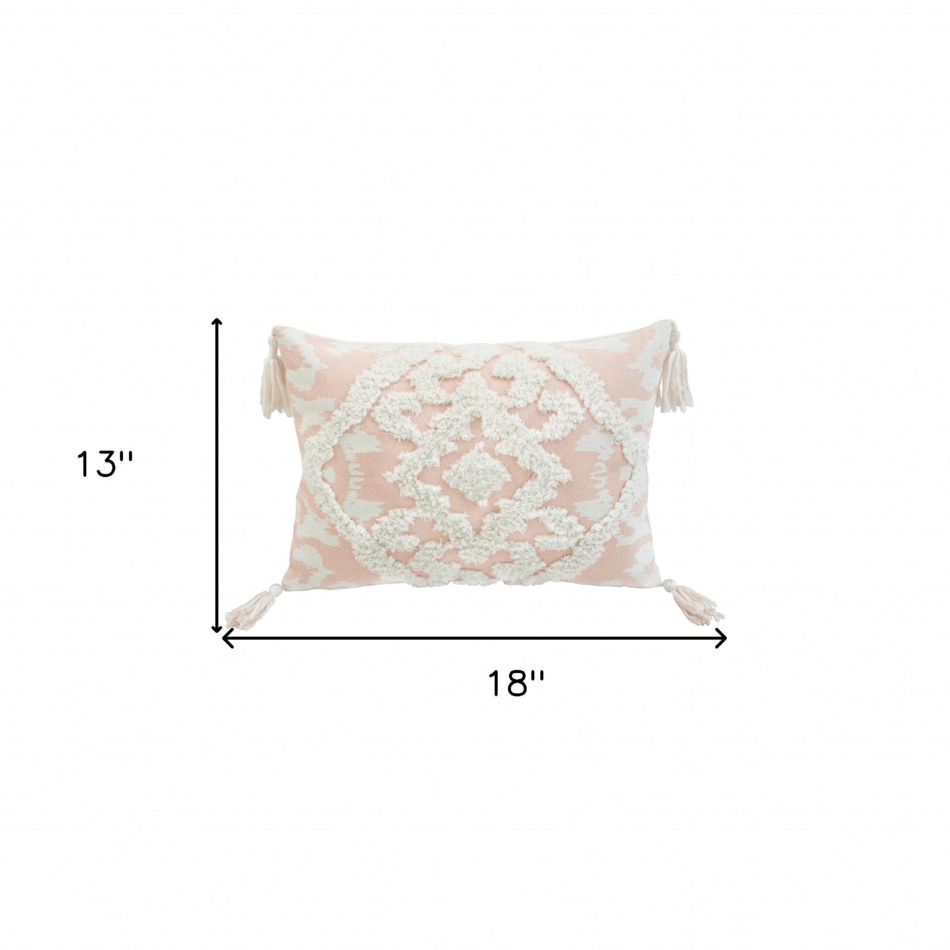 Add an air of fashion to your room and rejuvenate the space with this cute and fashionable 13" x 18" peach and white damask zippered polyester and cotton blend throw pillow with tassels. Fun and decorative tassels add some high end and hand-crafted textural designer touches. Great to use on its own or mix with other decorations for the perfect look. Decorative pillows are a great way to change up the look and feel of your space easily and quickly. 4" H x 13" W x 18" D