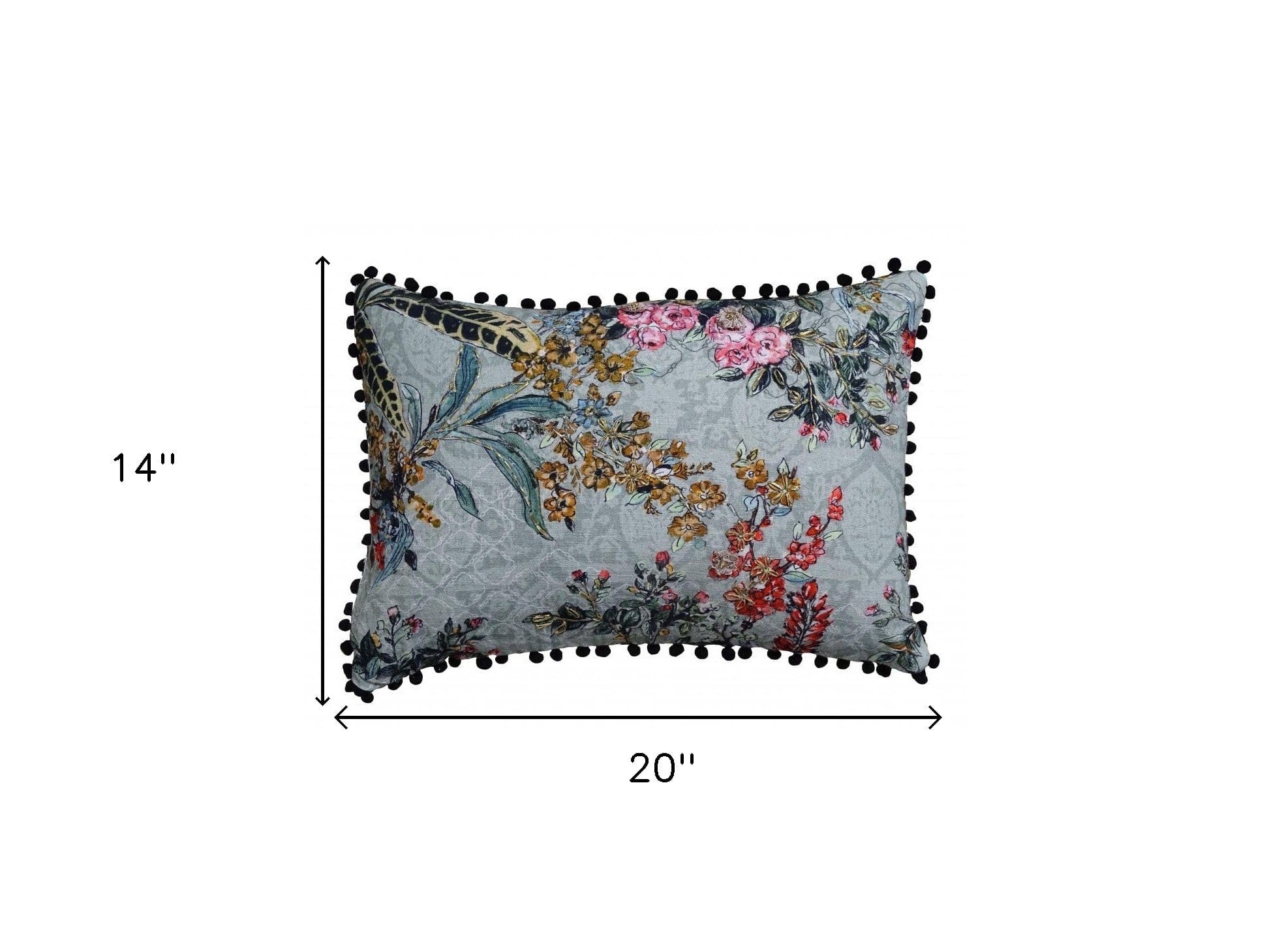 14" X 20" Green And Yellow Floral Zippered Handmade Cotton Blend Throw Pillow With Pom Poms