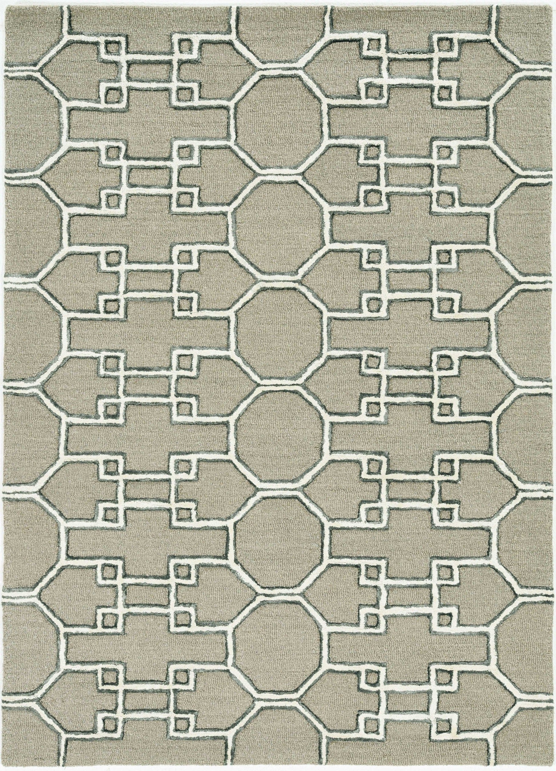 Upton patterns are rooted in classic design, from ancient civilizations, Mayan tiles, Parisian garden design, Asian trellis, and Moroccan ribbon, but are retooled to appeal to todays styles. Some patterns and color combos are a play on Mid-century modern design, offering an almost optical illusion. While the color ways are muted and meant to work with various design genres, everything from contemporary to transitional to traditional, these rugs add another layer of visual interest to any space. These rugs are handtufted in India of wool and viscose with a hi/lo construction. Libby Langdon Upton 4305 Mocha/Ink Asian Trellis 144" x 180". Hand-Tufted of Wool with Viscose Highlights with Cotton Backing. Made in India. Vacuum regularly & spot clean stains. Professional cleaning recommended periodically.