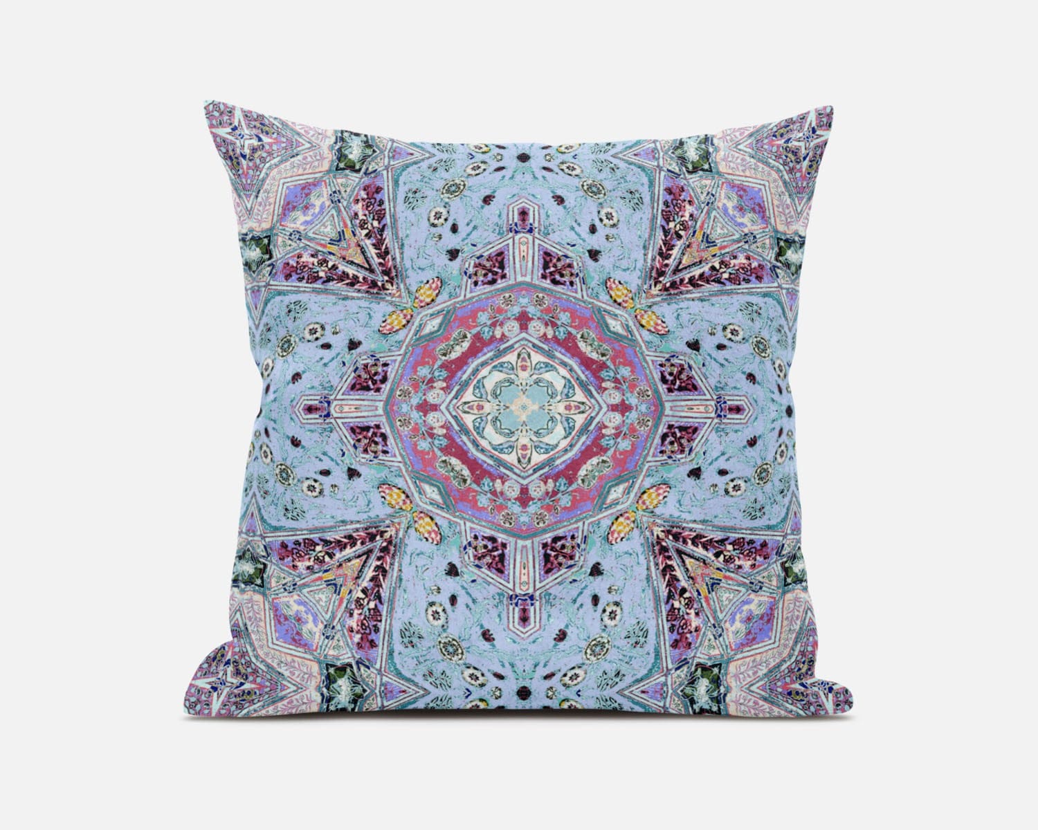 Standing out in fashion and function, this Blue Magenta Boho Floral Zippered Suede Throw Pillow combines mesmerizing design elements in a vibrant color palette. This piece hosts a blend of light blue and magenta tones in flower ceremonial geometric designs for visual intrigue. The high-quality digital print on the pillow is designed to last for years while maintaining color vibrancy. Crafted from durable suede fabric that has a soft and smooth surface texture, making it a fully functional and decorative piece of art that is meant to spruce up your living room. This zippered pillow is filled with a durable polyfill insert which gives it a soft cushiony feel with a fluffy appearance that will add to the aesthetics and comfort of your sofa, chair, or couch. Add colors and patterns to your home with this beautiful decorative throw pillow that will stay in tune with trends and tradition. 16” x 16” x 5”