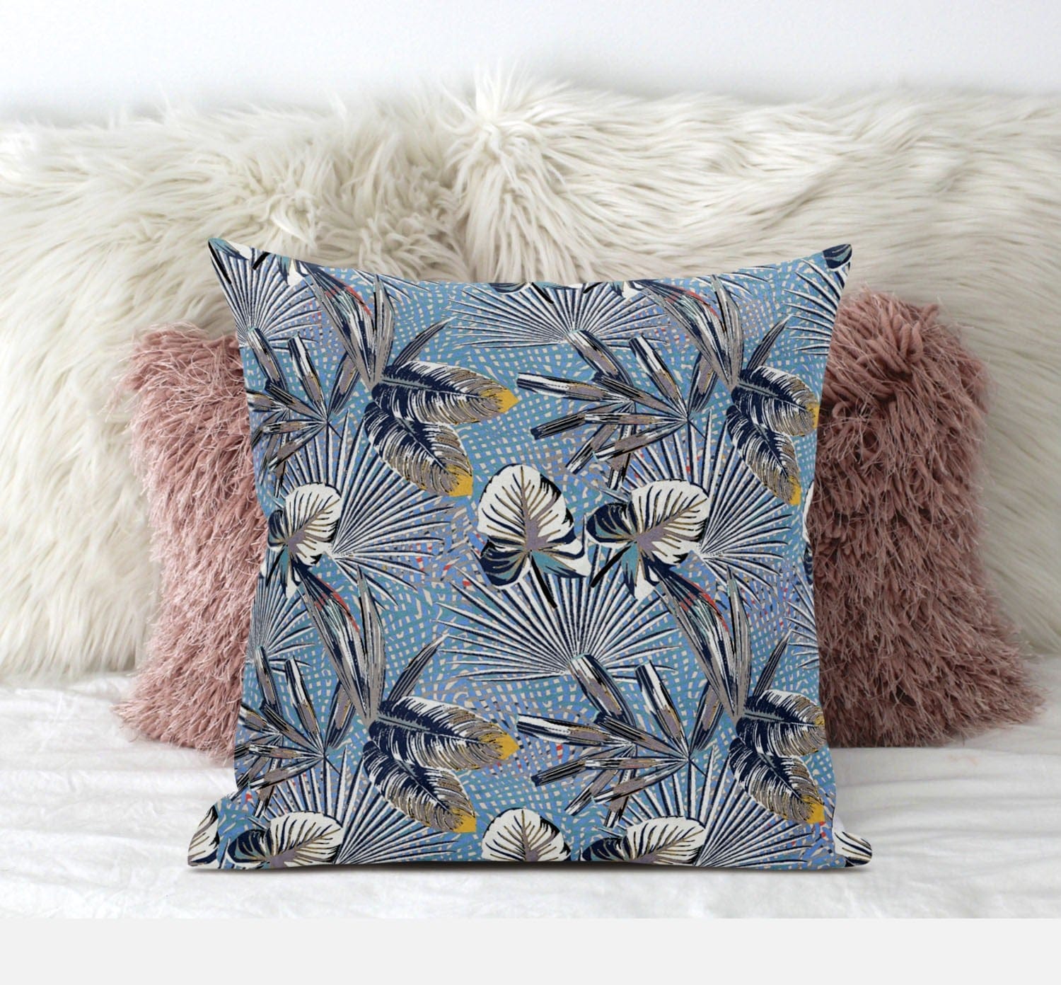 Bring the subtle air of the ocean and the carefree nature of a bohemian style into your abode with this Gray Blue Tropical Suede Throw Pillow. Brimming with lush foliage in gray, white, and pinch of yellow to create a pleasant contrast over the soft blue base that gives an illusion of an open sky hidden by a canopy of tropical leaves. This blown pillow is crafted from premium-quality suede fabric which is characterized by its soft and smooth surface texture for a delicate feel. With a durable polyfill insert, this pillow feels super soft with a fluffy look that makes it an excellent decorative accent in terms of fashion and functionality. If you want a splash of color amidst your neutral contemporary decor, opt for this throw pillow to evoke the tranquility of coastal shores and fill the room with a cheerful tone. 16” x 16” x 5”