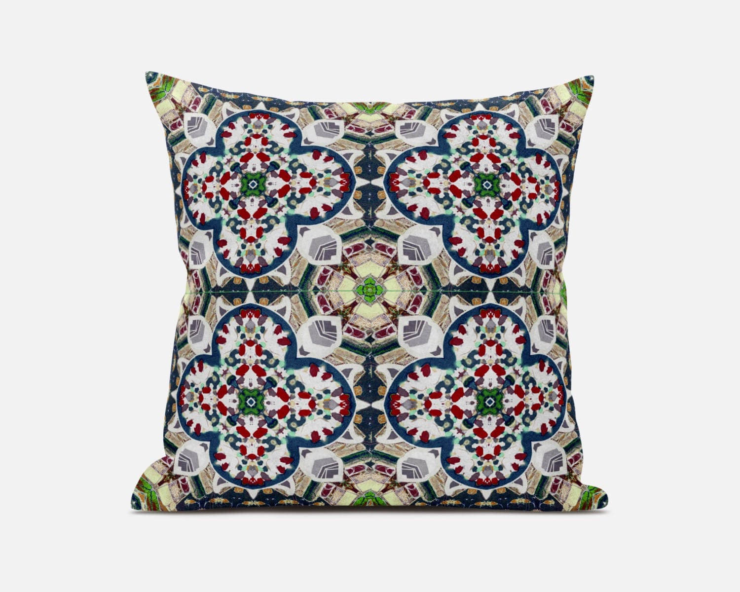 Delve into the concord of eye-catching hues in this Green White Cloverleaf Boho Zippered Suede Throw Pillow and bring life into your bohemian or contemporary living space. The geometric cloverleaf-like motifs of this bohemian style throw pillow in shades of green and white with the hints of red would harmonize flawlessly with any modern-day décor you have in your home. Crafted from a sturdy suede fabric, the pillow ensures durability with a soft and smooth texture, ideal for everyday use. The soft polyfill insert offers a luxurious and cozy feel while the zippered closure makes the cover easy to remove and clean. Bohemian accents in a modern-contemporary style home are all the rage these days, and this exquisitely designed pillow offers the perfect marriage between the two styles to spruce up your home. 16” x 16” x 5”