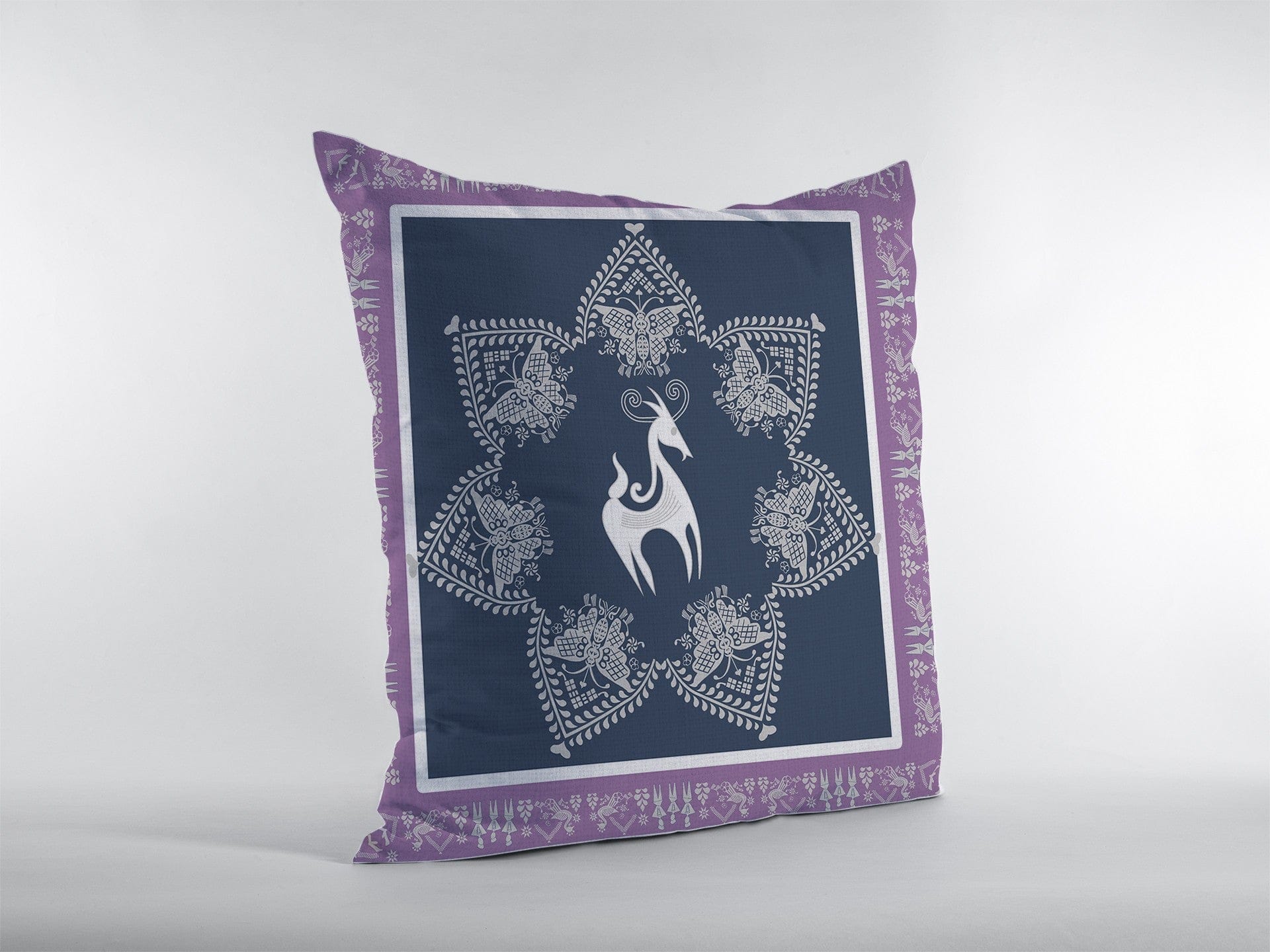 Combining booming colors with an understated print, this bold Navy Purple Horse Zippered Suede Throw Pillow is a great addition to any modern décor. The adventurous butterfly and horse prints against the deep navy blues and purples of the background make this pillow stand out in any room. The silky sheen and smooth surface texture can be attributed to the high-quality suede fabric which makes this pillow highly durable, soft, and easy to clean. It comes with a soft polyfill insert giving the pillow a plush and fluffy look while maximizing comfort. Also, the zippered closure makes the cover easily removable for cleaning purposes. Embolden the modern aesthetics of your home with the striking beauty of this decorative pillow and watch your living room come alive with a boho-chic charm. 16” x 16” x 5”