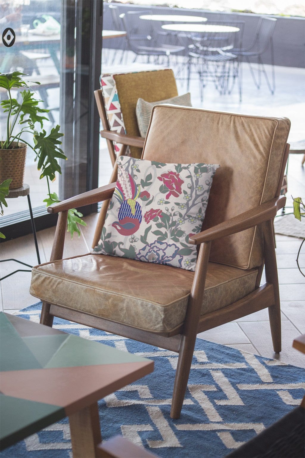 Combining botanical elements with an avian print, this Pink Sage Peacock Zippered Suede Throw Pillow is the perfect representation of spring to bring life into your bohemian-style home. Featuring sage green leafy elements with burgundy and gray-toned floral art combined with a multi-colored printed peacock against the white background makes for the perfect playground of spring elements all on a throw pillow. Draped in a soft yet sturdy suede fabric, the eco-friendly pillow comes with a zippered removable cover and is very easy to clean. The polyfill insert makes this decorative pillow as soft as the clouds with a fluffy look, perfect for supporting your neck and back when you lean on it. The alluring print coupled with the cool-toned hues melds together to make this throw pillow a flawless piece of art, fit for any bohemian-inspired home. 16” x 16” x 5”