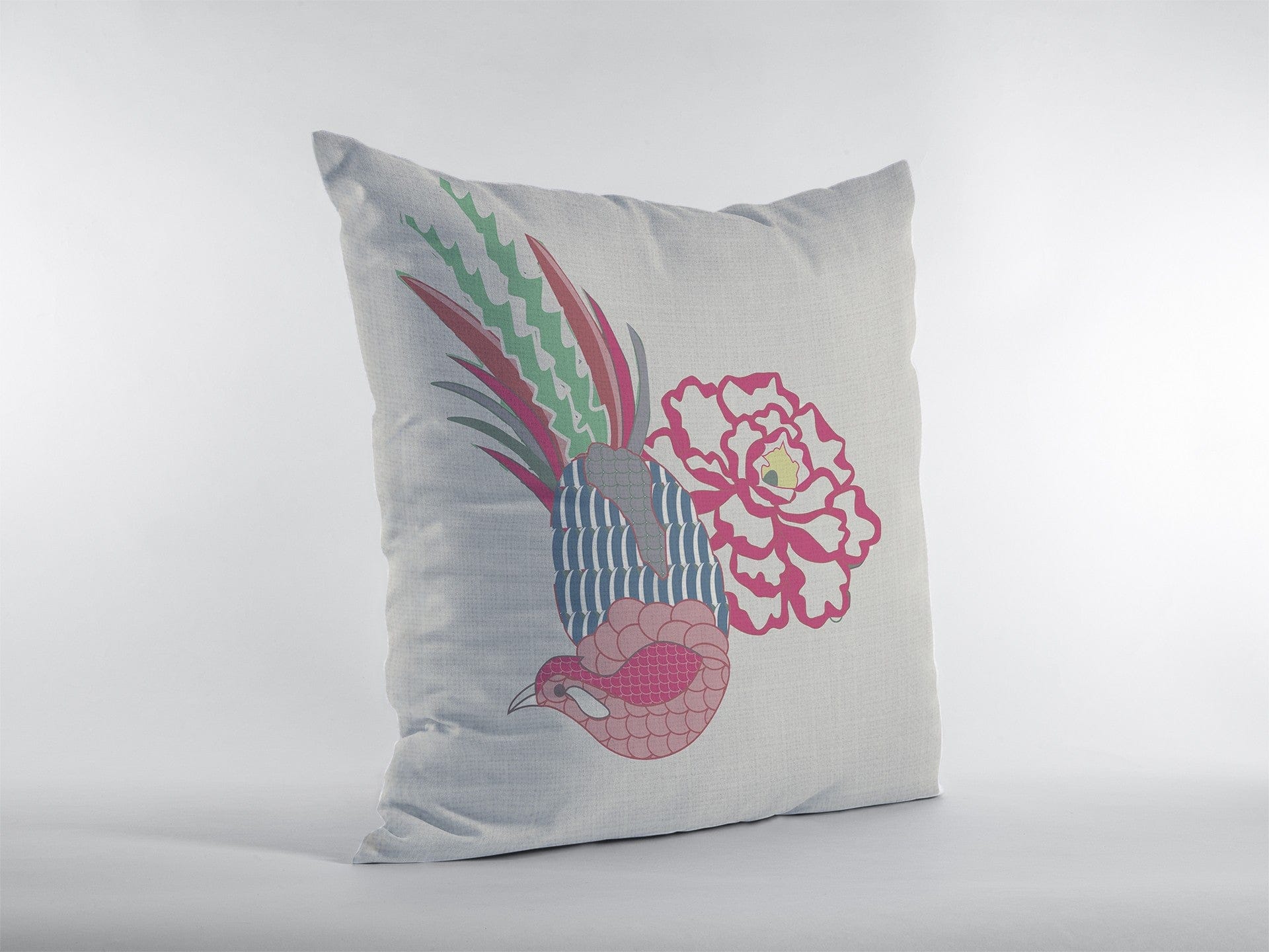 16” Pink White Peacock Zippered Suede Throw Pillow