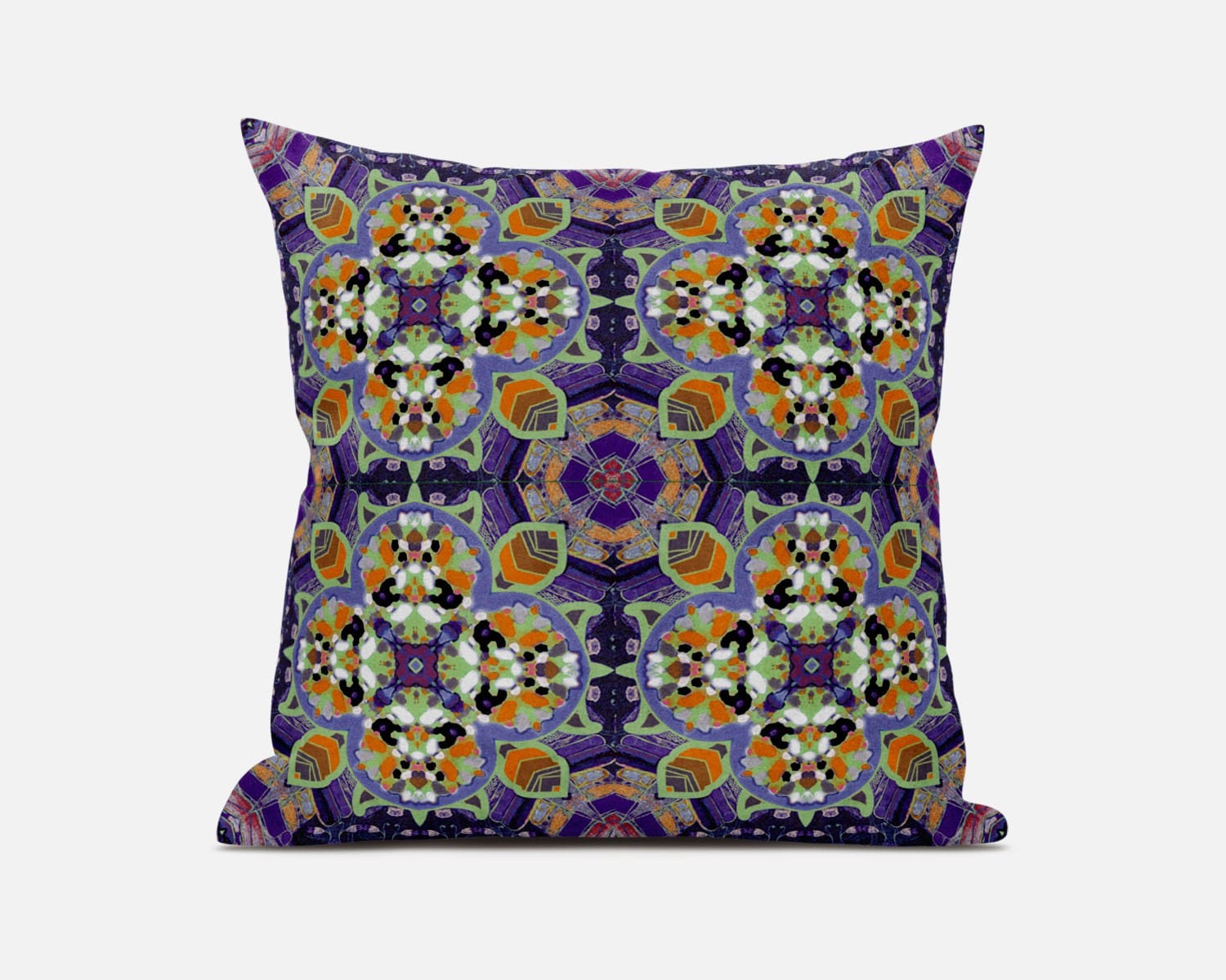 Let the contrasting hues of this Purple Orange Cloverleaf Boho Suede Throw Pillow enliven your living space with a sense of warmth and vibrance. The gorgeous purple-toned background is teeming with intricate cloverleaf and geometric patterns featuring pastel green and bright orange shades for visual interest. Crafted from a sturdy suede fabric, the pillow ensures durability with a soft and smooth texture, ideal for everyday use. The pillow features a seamles zipper closure for easy cleaning while the high-quality polyfill insert adds to the fluffy look while ensuring maximum comfort for relaxation. A piece of art on its own, this colorful throw pillow is sure to spruce up any modern or bohemian home. 16” x 16” x 5”