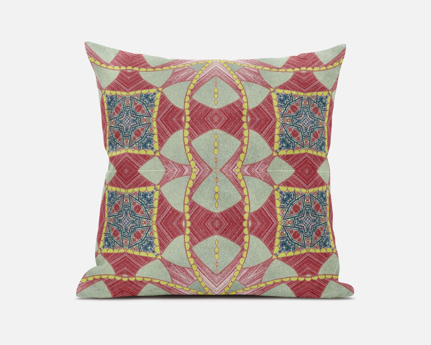 Enjoy the playful vibe of this Red Yellow Cosmic Circle Boho Suede Throw Pillow that exhibits joyful tones in a boho-chic fashion. The dusty red shade of the base is embellished with geometric motifs in sage and blue highlighted by yellow cosmic accents, giving a joyful essence to the pillow. The smooth texture of the appealing suede fabric is sure to add a luxurious touch to the piece while making the pillow highly durable with a soft hand. This pillow is blown and closed with a sturdy yet soft polyfill insert for a plush and fluffy look while maximizing comfort every time you lean on it. Make your living room look and feel more inviting with this stunning decorative pillow flaunted on the sofa, chair, or couch. 16” x 16” x 5”