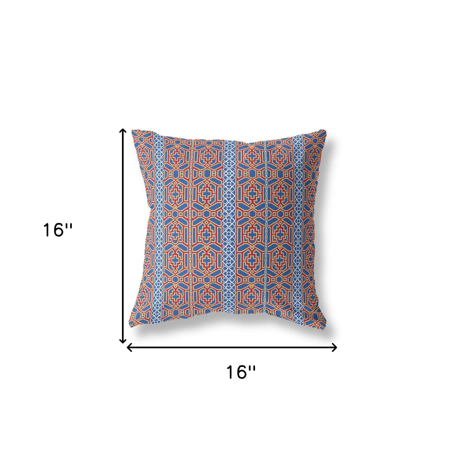 16" X 16" Blue And Red Geometric Blown Seam Suede Throw Pillow