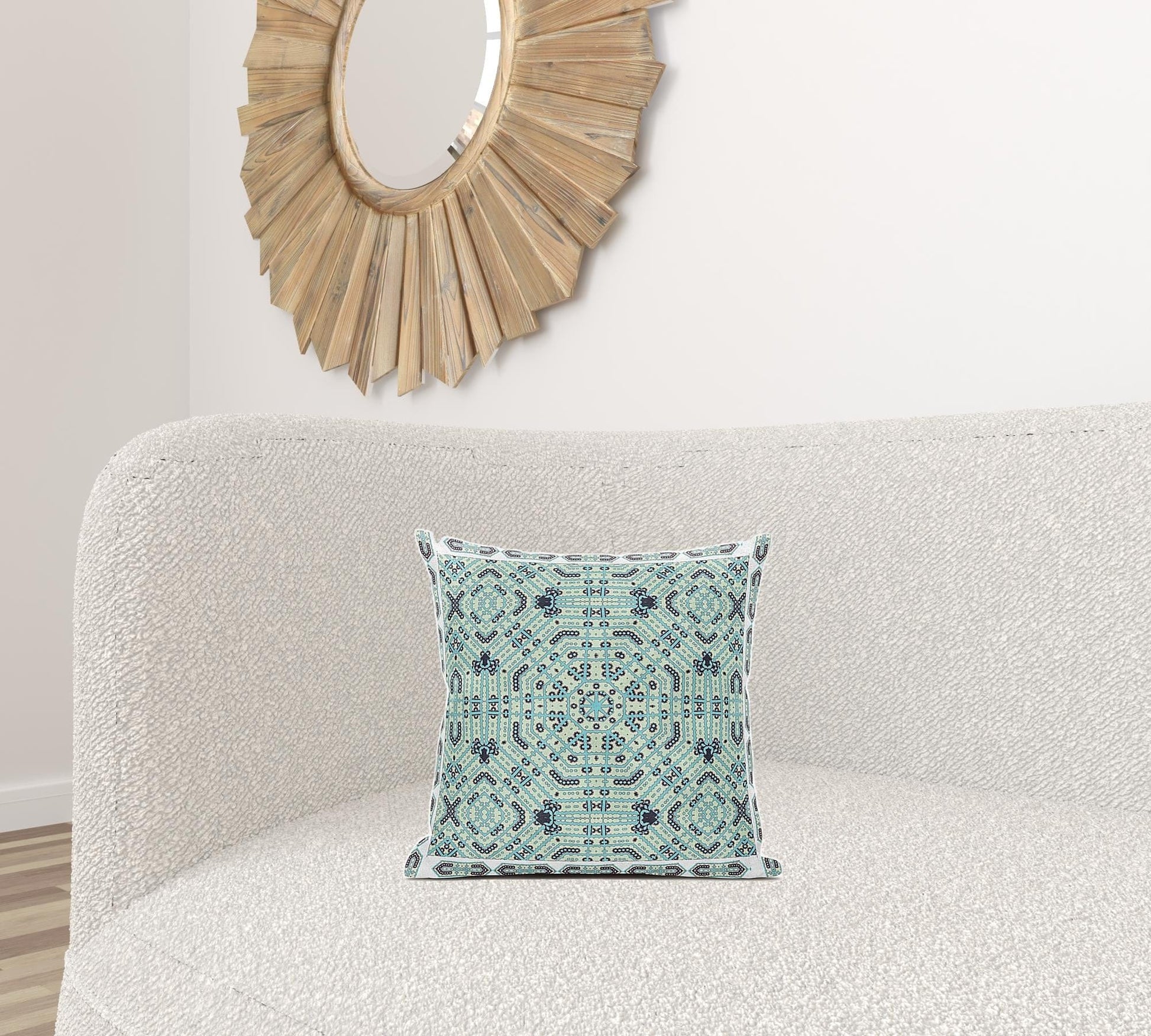 This 16" x 16" blue light green geometric blown seam suede throw pillow will add a beautiful decorative accent to your decor. Decorative throw pillows not only add color and dimension to your space but can be comfy and supportive when you are lounging and cuddling as well. A great decorative accessory for your favorite chair, to accent your sofa, or to use as part of your bed ensemble. 5" H x 16" W x 16" D