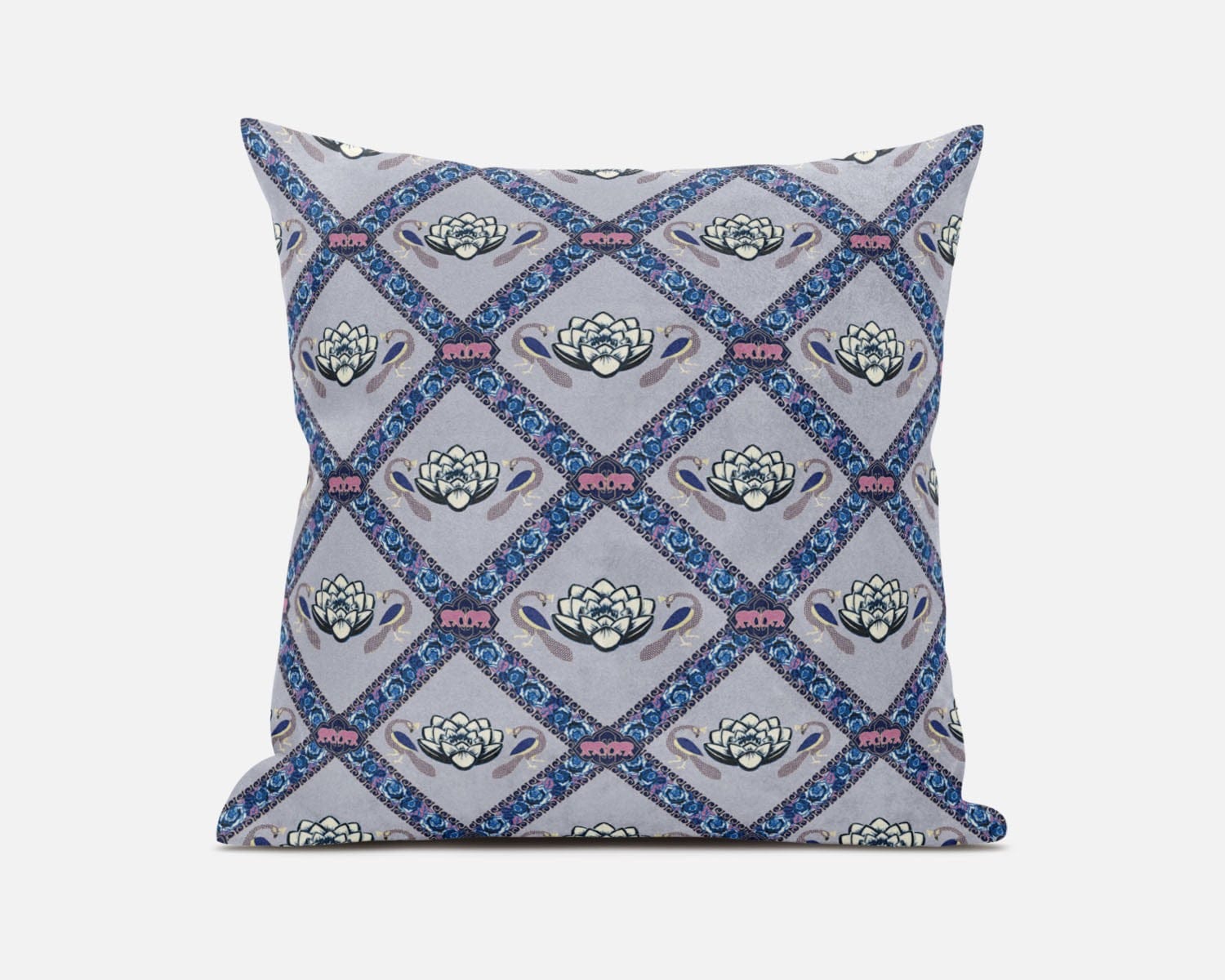 This 16" x 16" gray sea blue pink lotus floral blown seam suede throw pillow will add a beautiful decorative accent to your decor. Decorative throw pillows not only add color and dimension to your space but can be comfy and supportive when you are lounging and cuddling as well. Decorative pillows are a great way to change up the look and feel of your space easily and quickly. 5" H x 16" W x 16" D