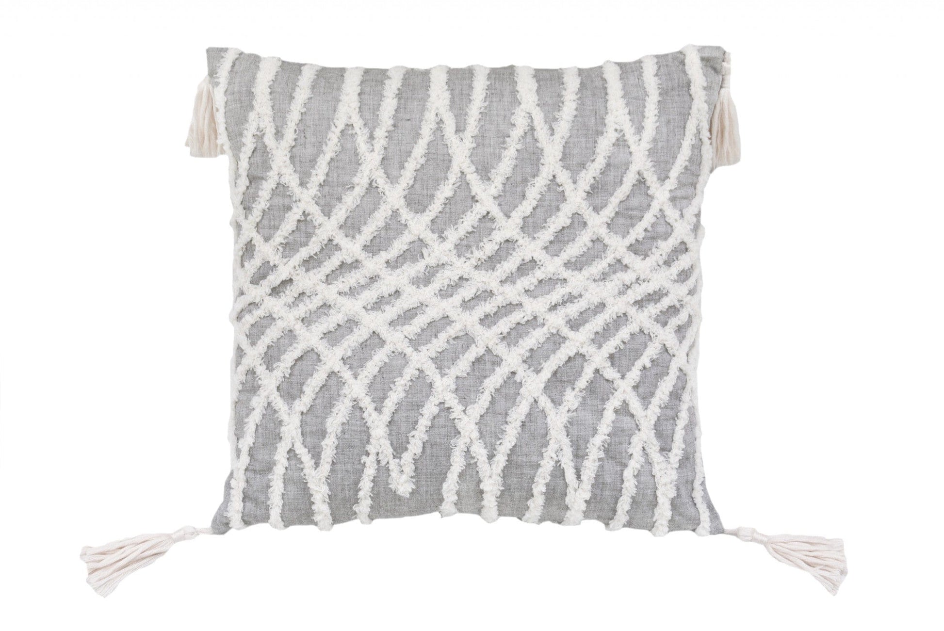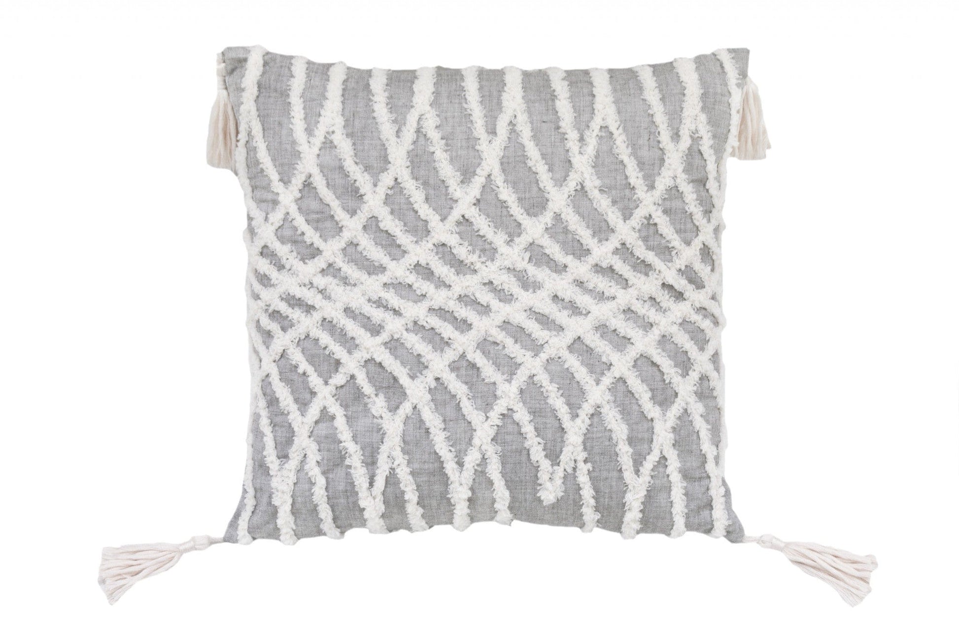 This 17" x 17" grey and white interlocking zippered polyester throw pillow with tassels will add a beautiful decorative accent to your decor. Charming decorative tassels give this design texture along with a hand-crafted look and feel. For anyone that loves to decorate or accent their space with color and texture. A great decorative accessory for your favorite chair, to accent your sofa, or to use as part of your bed ensemble. 4" H x 17" W x 17" D