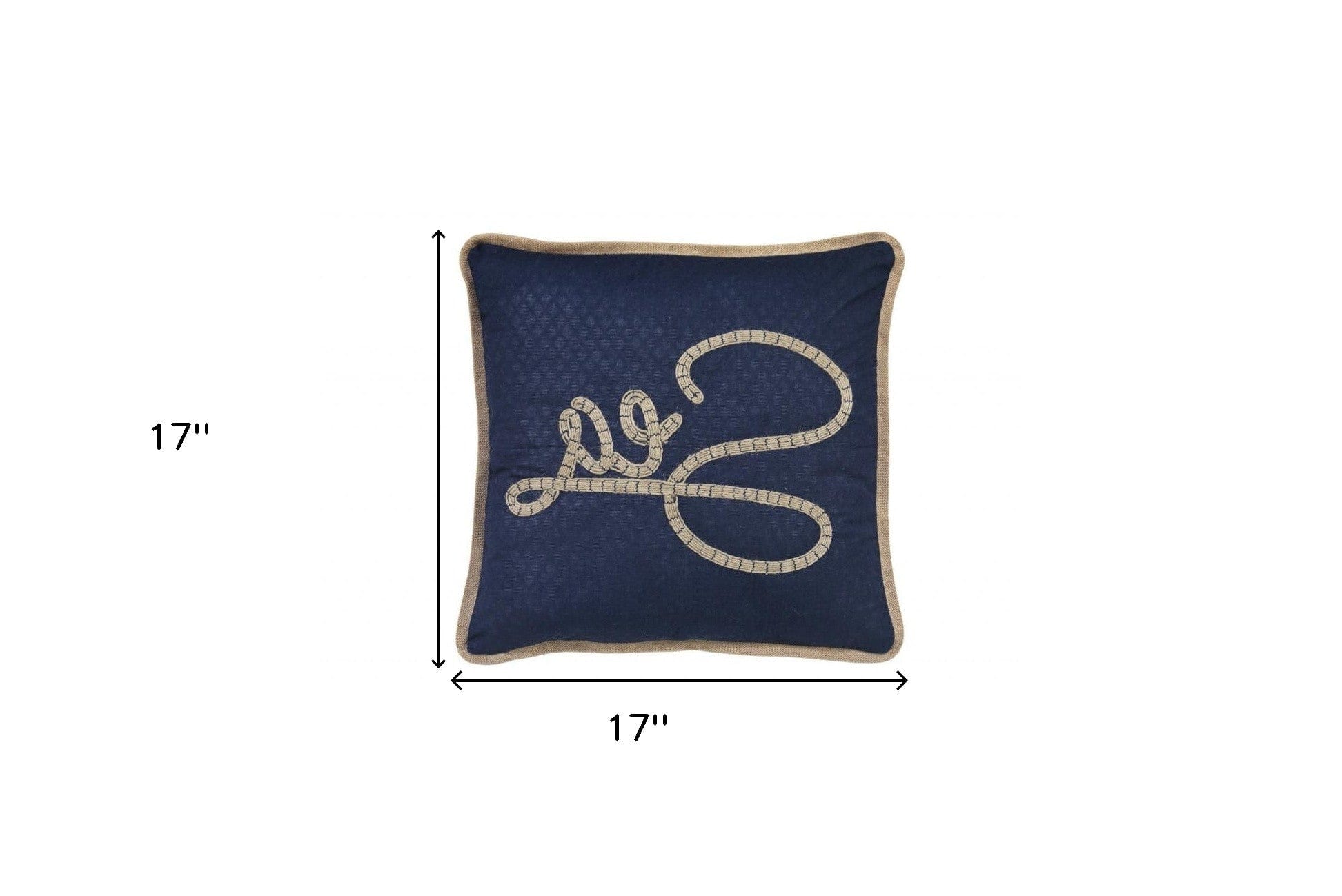 17" X 17" Navy Blue And Brown Text Zippered Polyester And Burlap Blend Throw Pillow With Embroidery