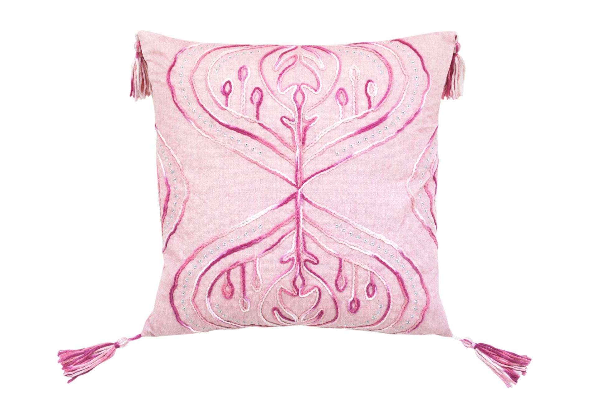 The perfect complement to your sofa, favorite chair, or bed, this 17" x 17" pink white and silver abstract zippered polyester throw pillow with tassels is a great decorative accent. Charming decorative tassels give this design texture along with a hand-crafted look and feel. Decorative throw pillows not only add color and dimension to your space but can be comfy and supportive when you are lounging and cuddling as well. Decorative pillows are a great way to change up the look and feel of your space easily and quickly. 4" H x 17" W x 17" D