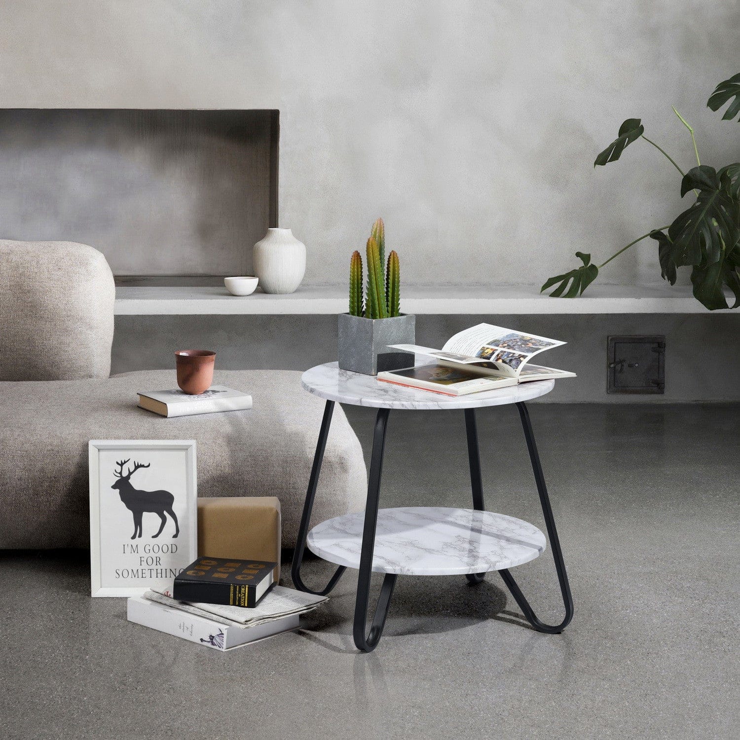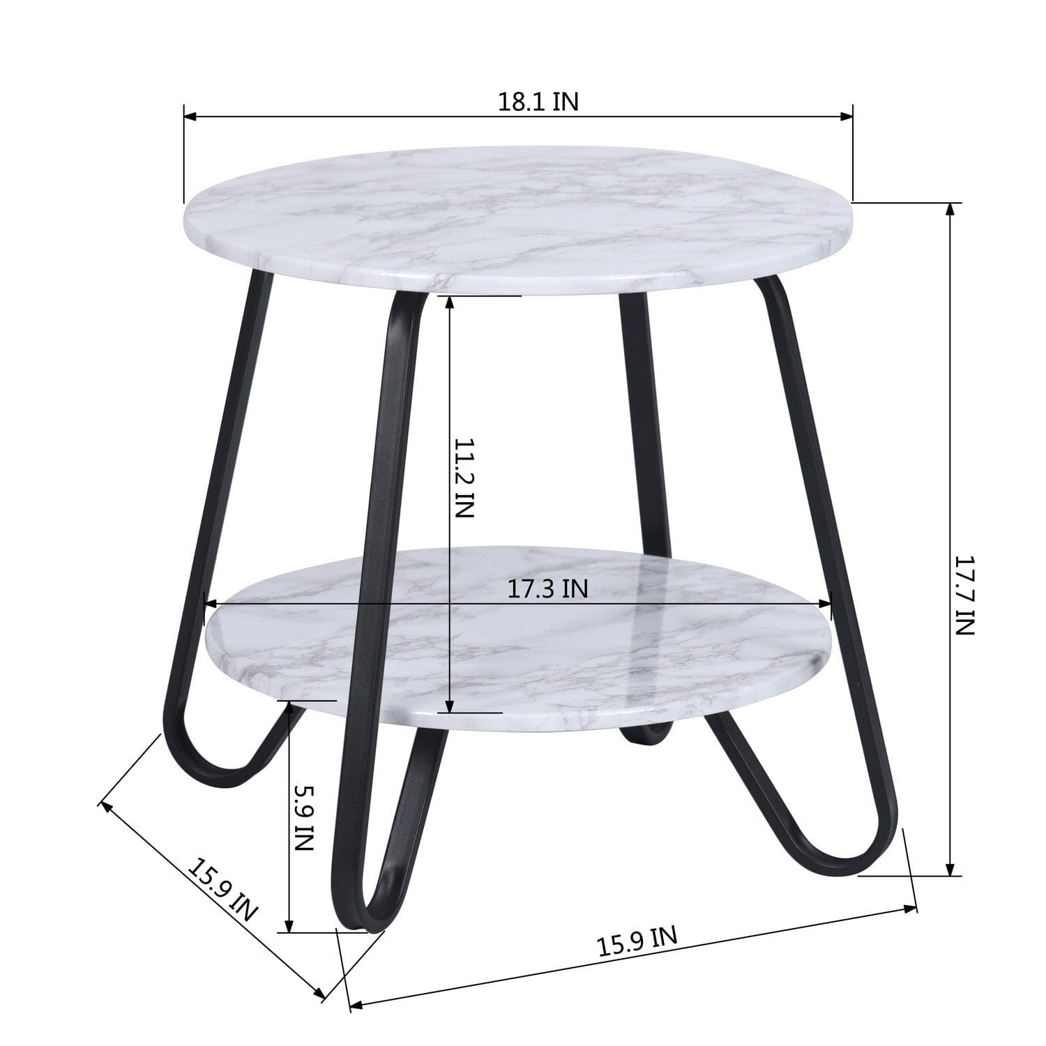 Distinctive in style, the 18" black and marble white manufactured wood and steel round end table radiates a versatile charm. This marvelous end or side table is made from high quality manufactured wood. The black coloration of the high quality steel base marries nicely with the marble white manufactured wood top. Side tables are a great way to flank your sofa, use as an accent next to your favorite chair, or can even be used bedside. You can match it with other pieces to get the ideal look for your place. 17.7" H x 18.1" W x 18.1" D