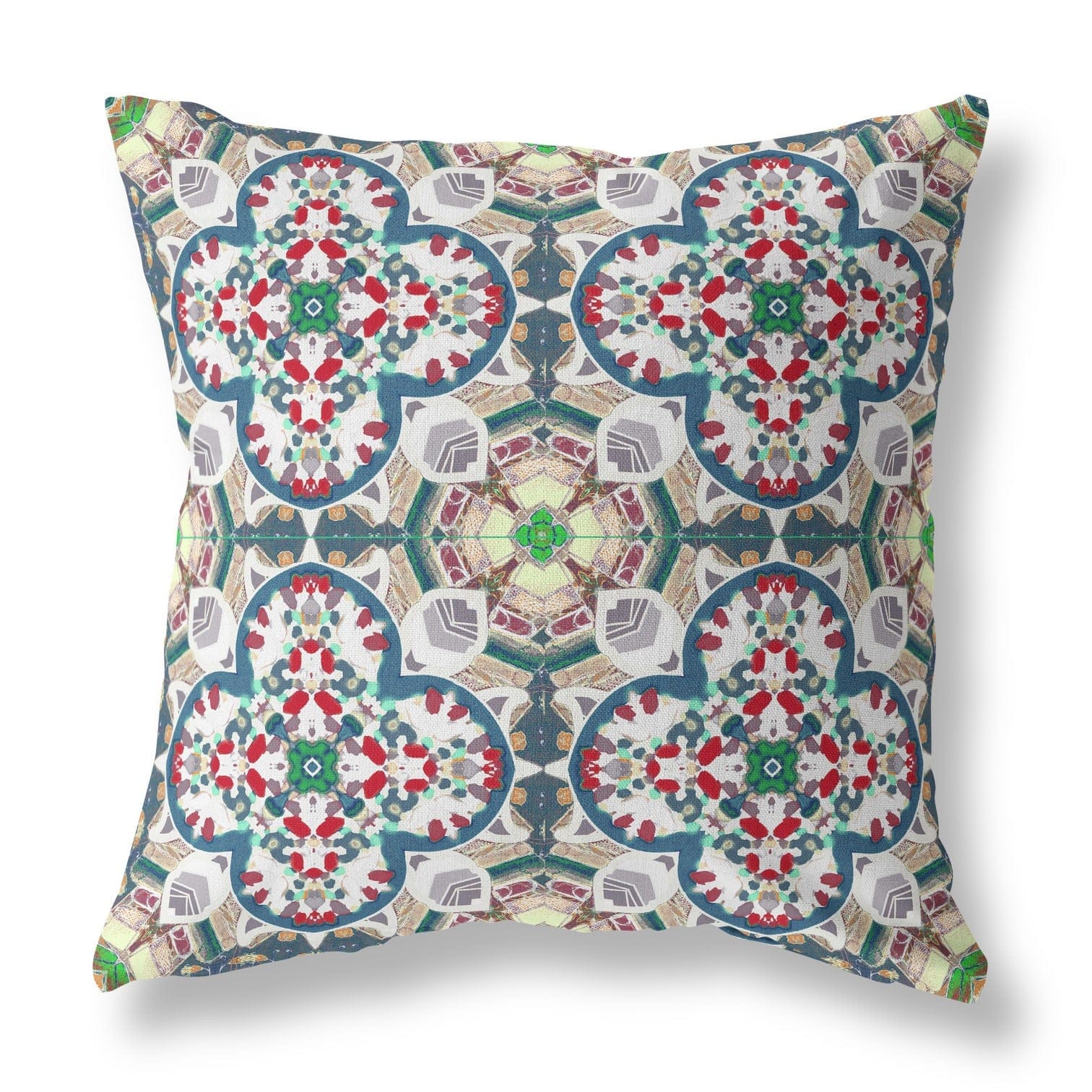 Delve into the concord of eye-catching hues in this Green White Cloverleaf Boho Zippered Suede Throw Pillow and bring life into your bohemian or contemporary living space. The geometric cloverleaf-like motifs of this bohemian style throw pillow in shades of green and white with the hints of red would harmonize flawlessly with any modern-day décor you have in your home. Crafted from a sturdy suede fabric, the pillow ensures durability with a soft and smooth texture, ideal for everyday use. The soft polyfill insert offers a luxurious and cozy feel while the zippered closure makes the cover easy to remove and clean. Bohemian accents in a modern-contemporary style home are all the rage these days, and this exquisitely designed pillow offers the perfect marriage between the two styles to spruce up your home. 18” x 18” x 5”
