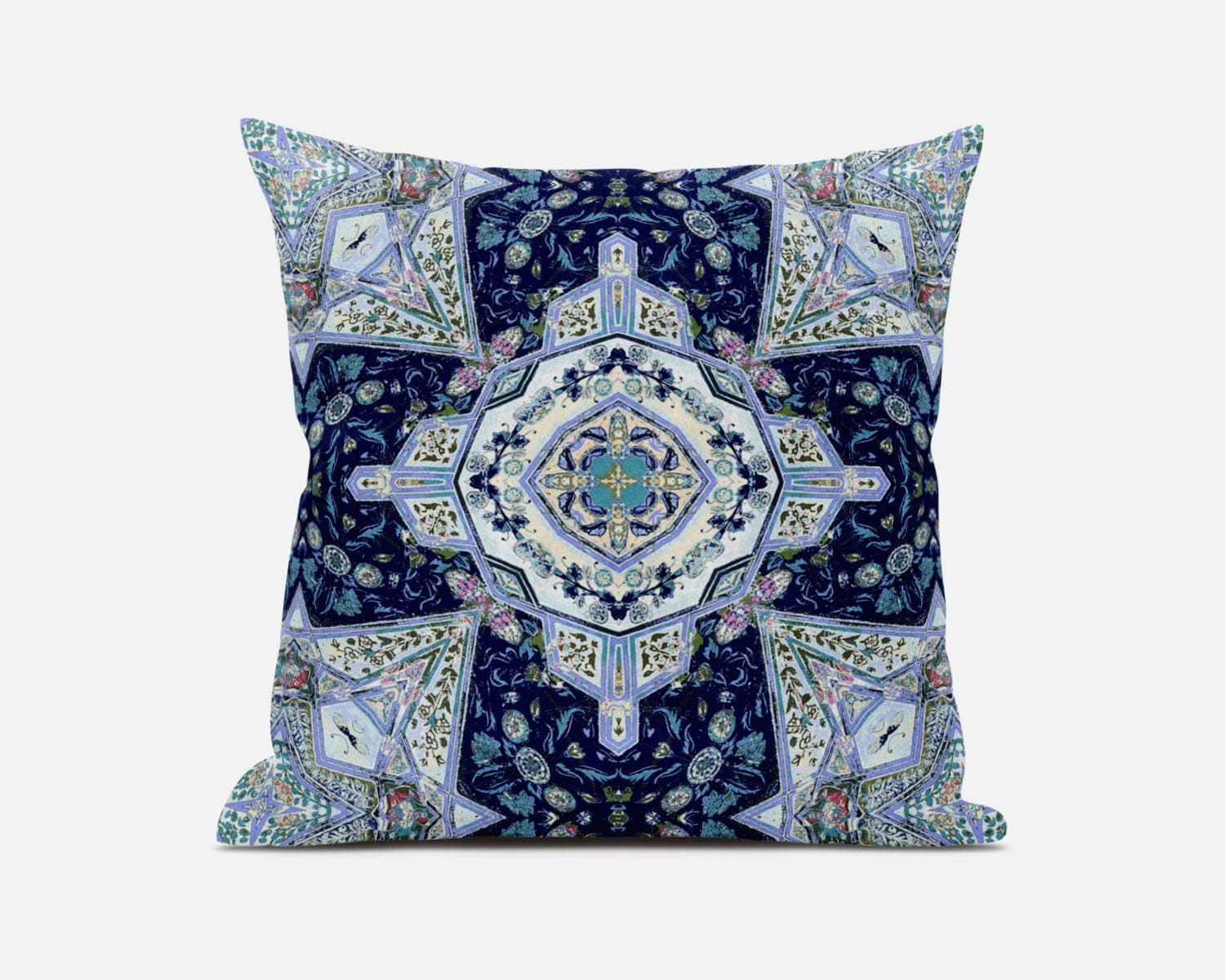 Binding between trend and tradition in its exquisite design patterns, this Indigo Blue Floral Geo Suede Throw Pillow is sure to satisfy the needs of any modern or bohemian home. This design comes in pastel tones with a blend of indigo and light blue to elevate the floral medallion artwork and the ceremonial geometric shapes for aesthetic wonder. The high-quality digital print on the pillow has been made to last for years while maintaining its color vibrancy. Made from top-notch suede fabric, which is highly durable to last for a long time, while the soft and smooth surface texture provides a glossy sheen for a plush appearance. This zippered pillow features a high-quality polyfill insert for optimum comfort while making the piece super fluffy for a luxurious feel on the touch. The lovely fusion of color and intriguing patterns makes this decorative throw pillow an ideal accent for a range of interior themes and decors. 18” x 18” x 5”