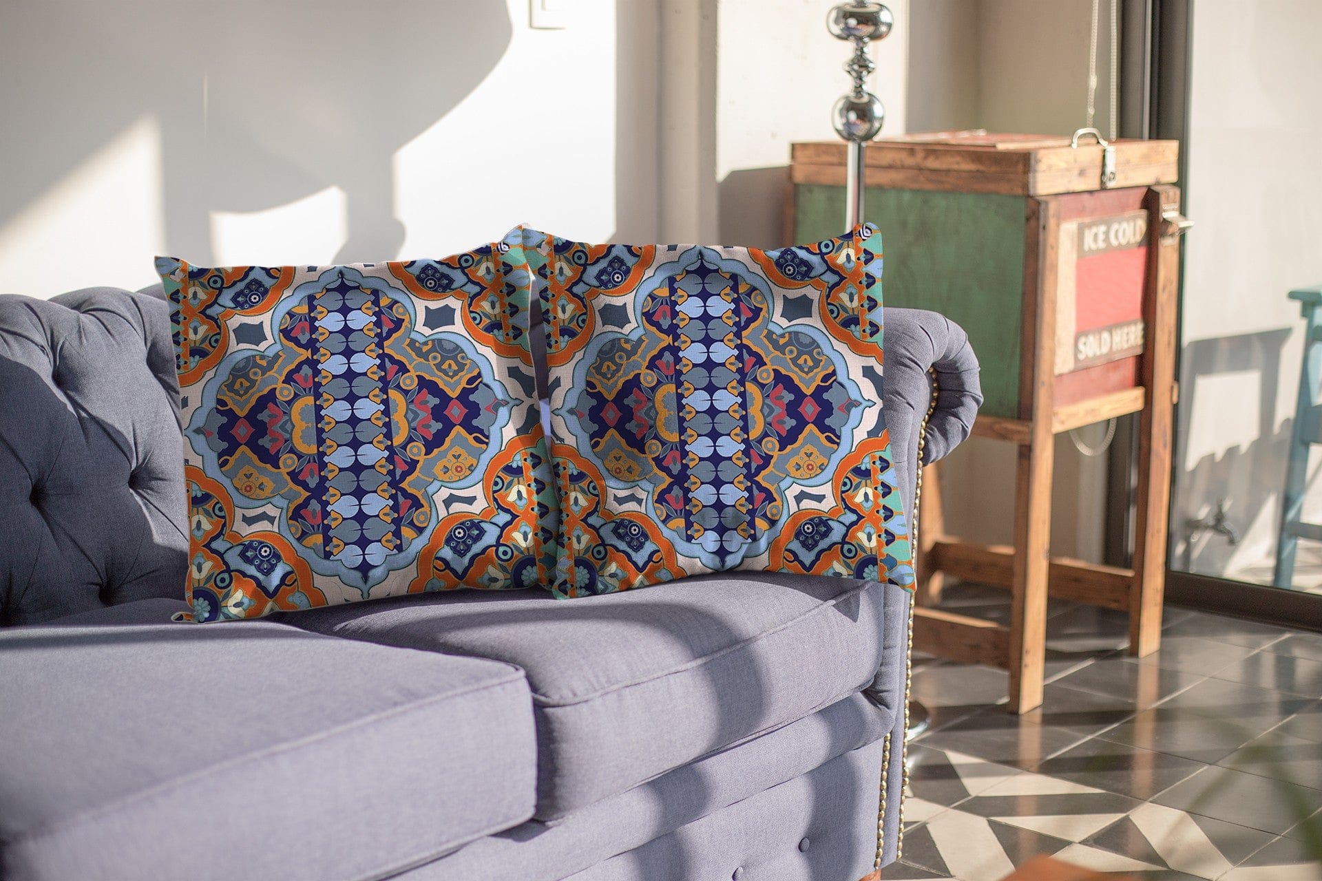 Bringing a new take on floral elements with modern and bohemian ensembles in mind, this Orange Blue Decorative Suede Throw Pillow will introduce a unique artistic flair to your home. The alluring design features rustic oranges with shades of blue accents to create a floral medallion with eclectic abstract patterns for visual intrigue. The color intensity of this design is brought to life with its high-quality print, all while ensuring a long-lasting look and feel. This decorative pillow is made in the United States with premium quality leather-like suede fabric for enhanced durability and utmost softness, making it a plush accent piece for your home. To ensure a fluffy look with a soft and cozy feel, this pillow is blown and filled with a durable polyfill insert for a comfortable experience. If you want a cheerful boho-chic element in your home, this eye-catching throw pillow is sure to draw your attention. 18” x 18” x 5”
