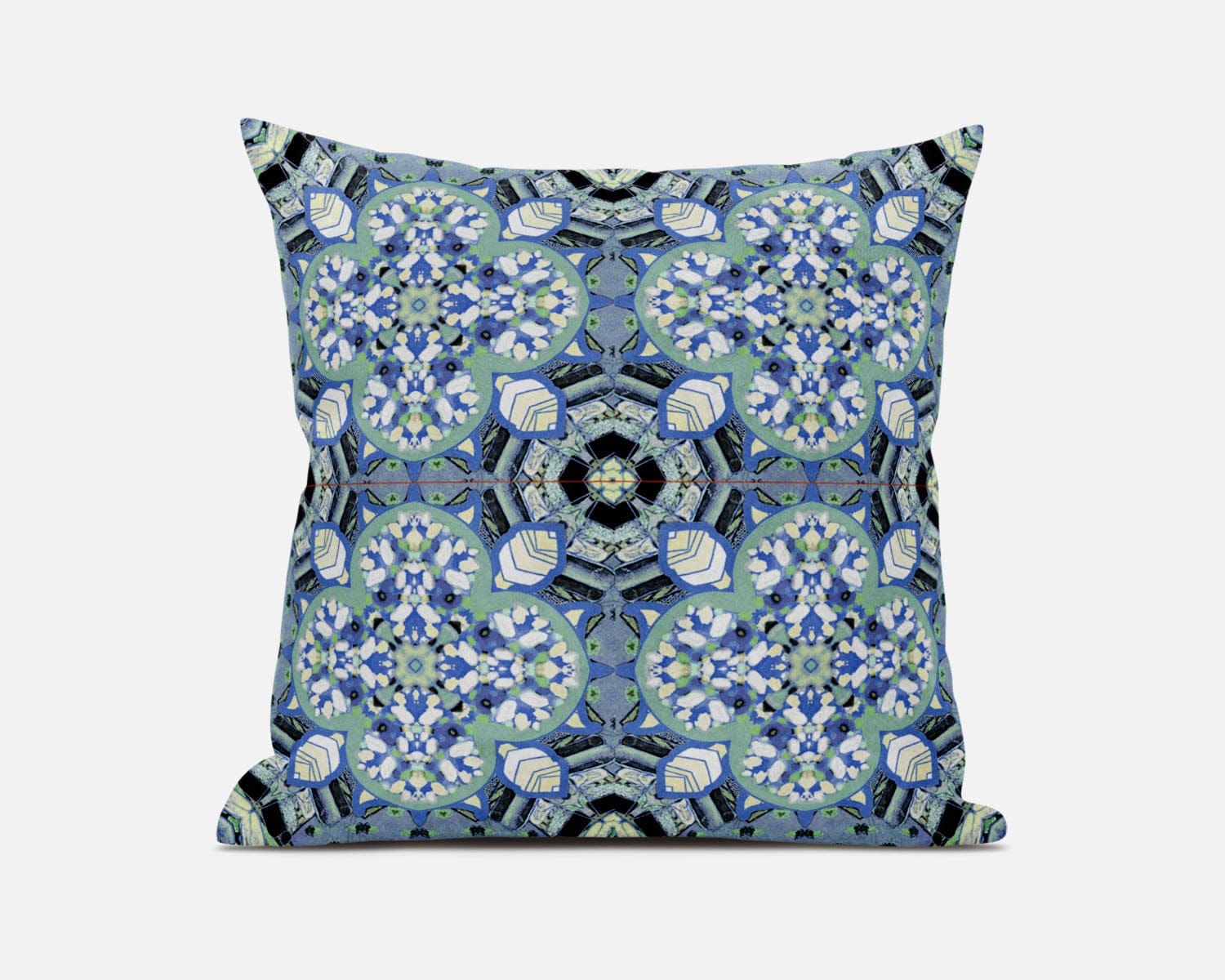 Bring a pop of bohemian blue into your contemporary home with this striking Sapphire White Cloverleaf Boho Zippered Suede Throw Pillow. Featuring a rosette cloverleaf pattern, the stunning blues of the pillow with the white leaflike shards and black edgings make for the perfect boho accent piece in a modern interior style. The pillow is carefully crafted with a premium suede fabric that gives it a feel of luxury while also being functional for everyday use. The soft polyfill insert makes it super fluffy and cozy to rest on while the zippered closure gives a seamless finish with added convenience. Bring a sense of tranquility into your living space with this cozy throw pillow that can almost be compared to a piece of fine art on its own. 18” x 18” x 5”