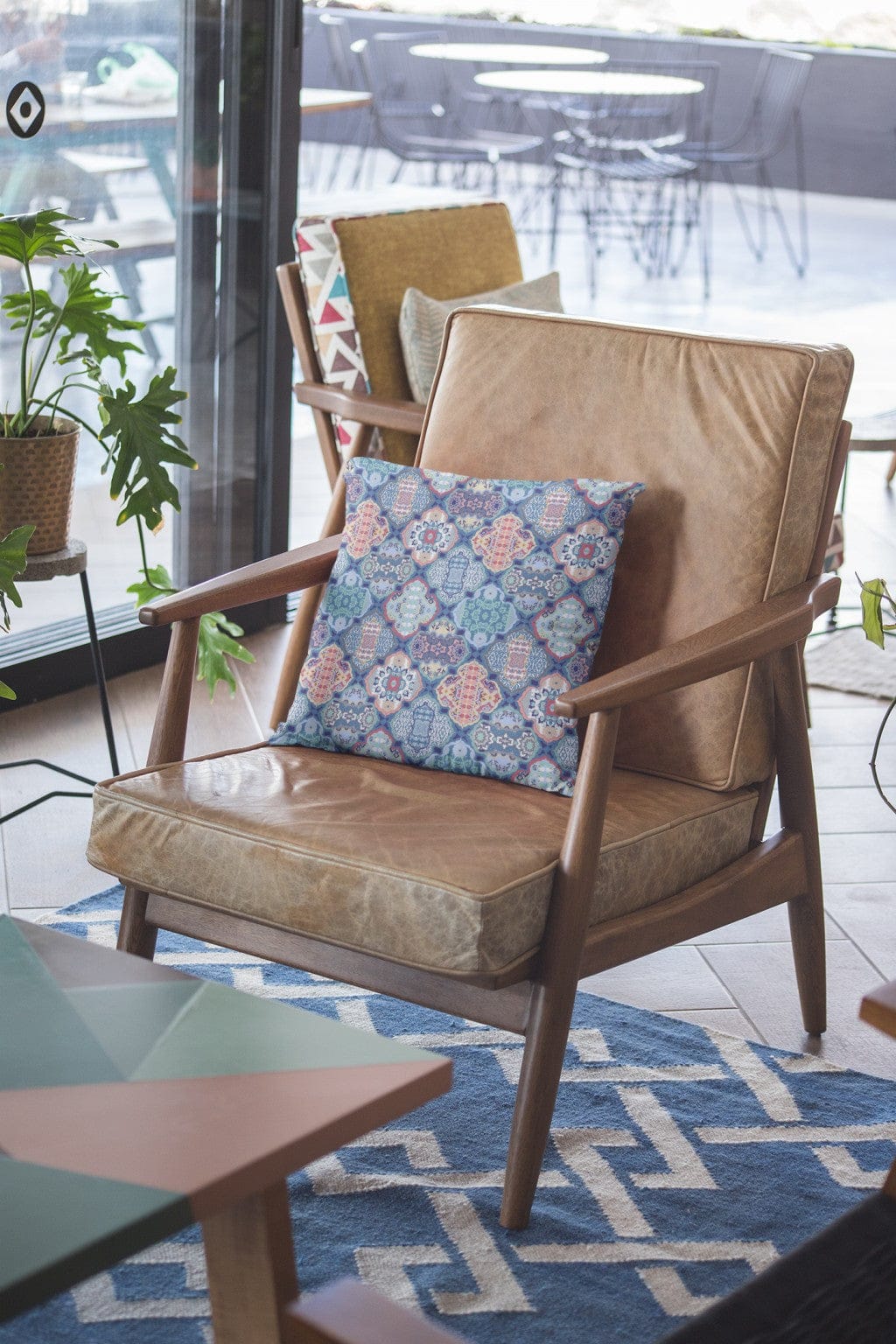 Give your living space a touch of bohemian spirit with this intricately designed Turquoise Red Trellis Suede Throw Pillow that features a blend of blues to create a relaxing ambiance. The floral trellis flaunts a medley of cool-toned turquoise, navy, white, and sky blue with pops of red and yellow to give this piece a boho-chic appeal. The silky-smooth aesthetic of the suede fabric gives this pillow a luxurious and opulent look with a delicate drape while ensuring long-lasting durability to serve you for years. The blown and closed cushion almost feels like a plush cloud with its soft polyester filling insert. Pair this pillow with neutral-colored decors to create a harmonious blend of colors that evoke a sense of serenity in the room. 18” x 18” x 5”
