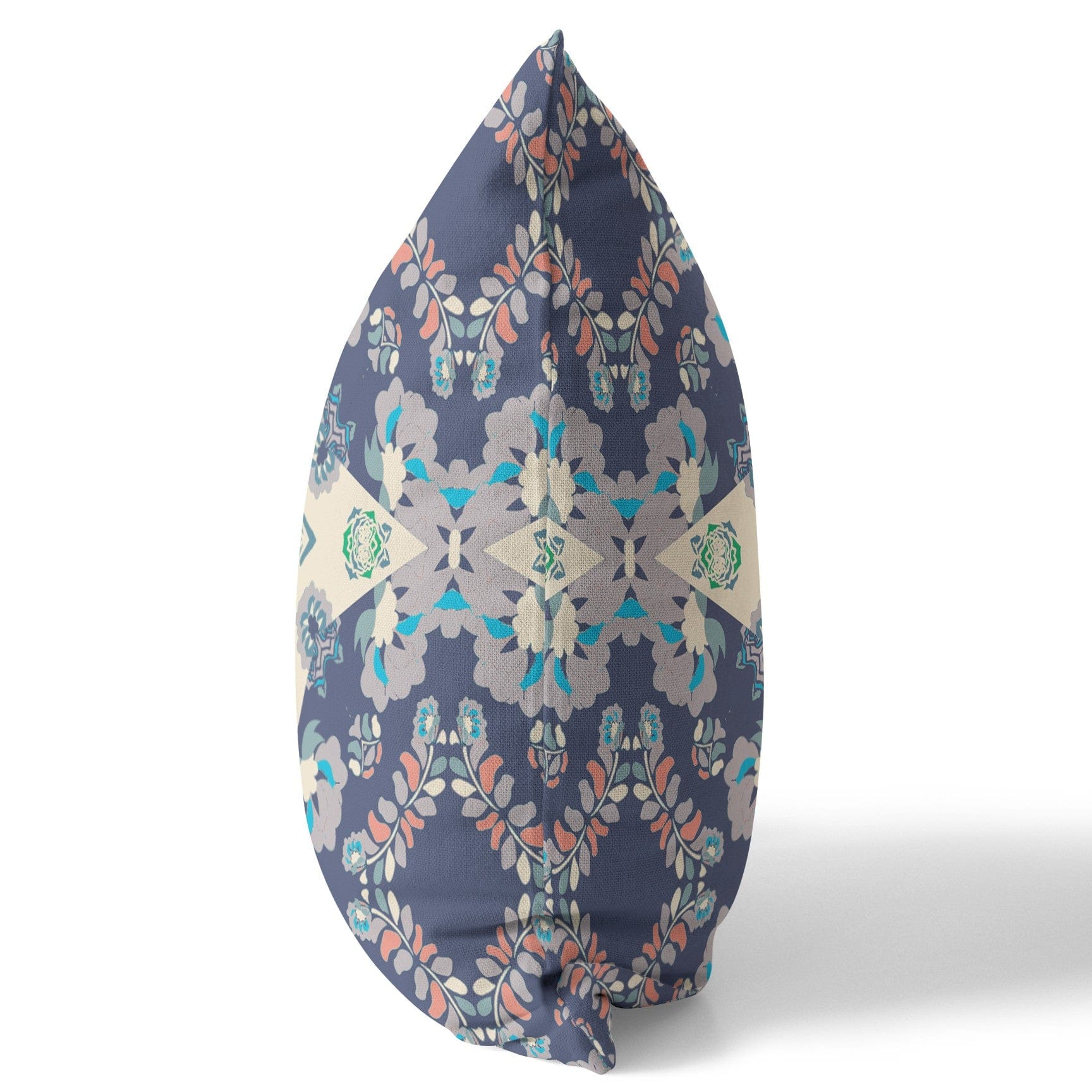 18" X 18" Blue And Off White Floral Blown Seam Suede Throw Pillow