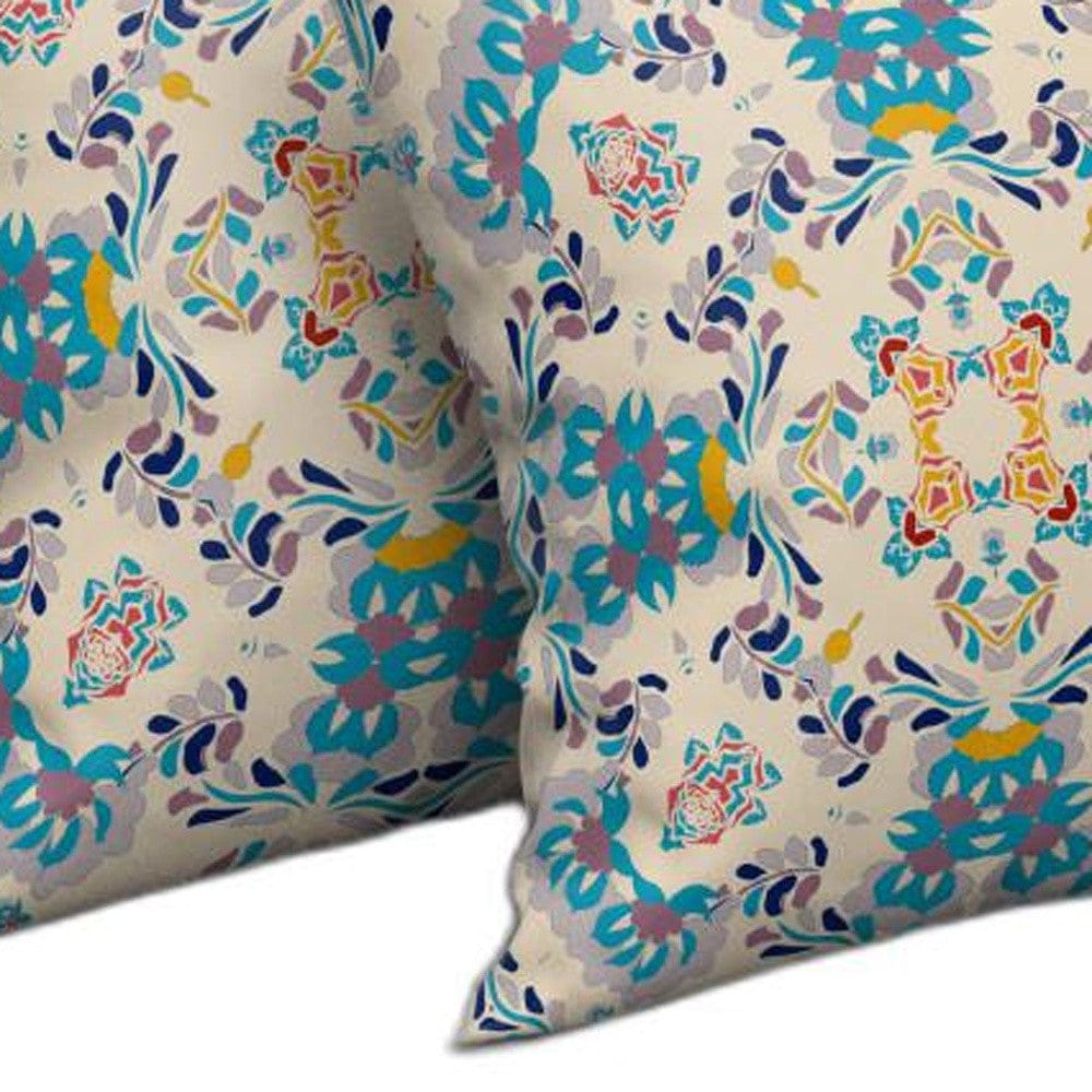 18" X 18" Off White And Blue Abstract Blown Seam Suede Throw Pillow