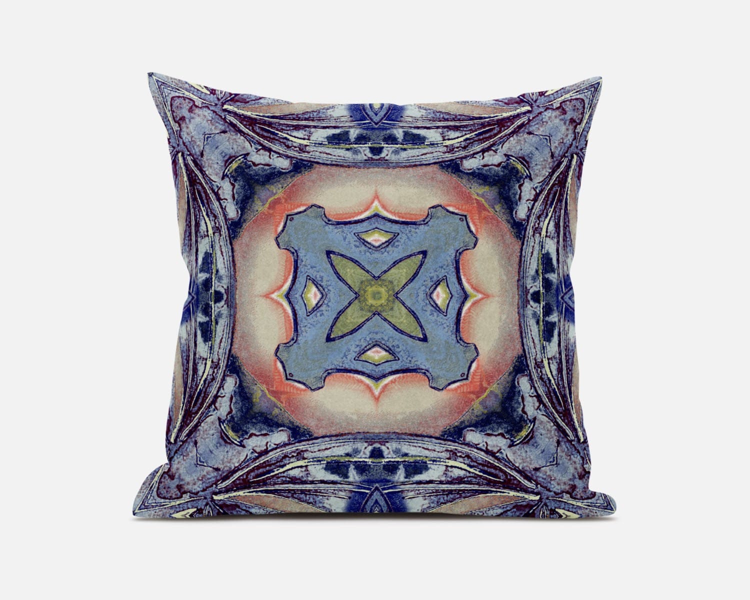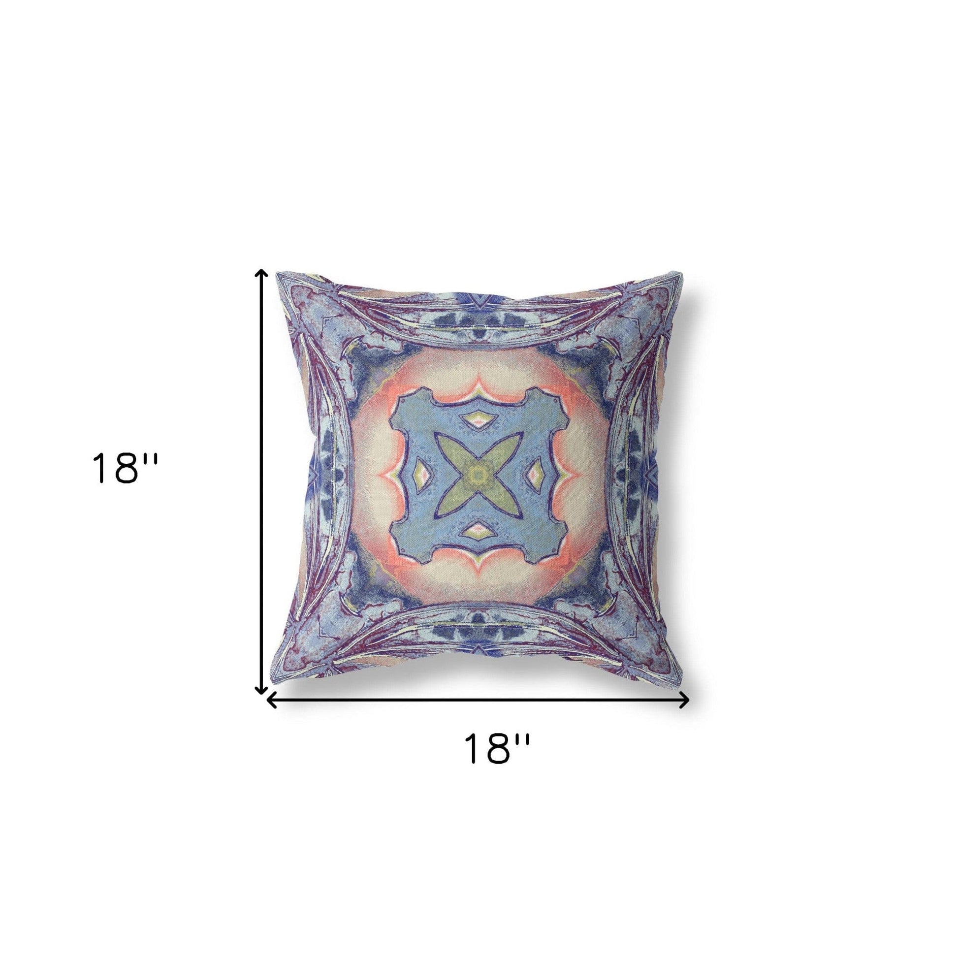 This 18" x 18" sky blue indigo muted peach geometric zippered suede throw pillow will add a beautiful decorative accent to your decor. Decorative throw pillows not only add color and dimension to your space but can be comfy and supportive when you are lounging and cuddling as well. A great decorative accessory for your favorite chair, to accent your sofa, or to use as part of your bed ensemble. 5" H x 18" W x 18" D