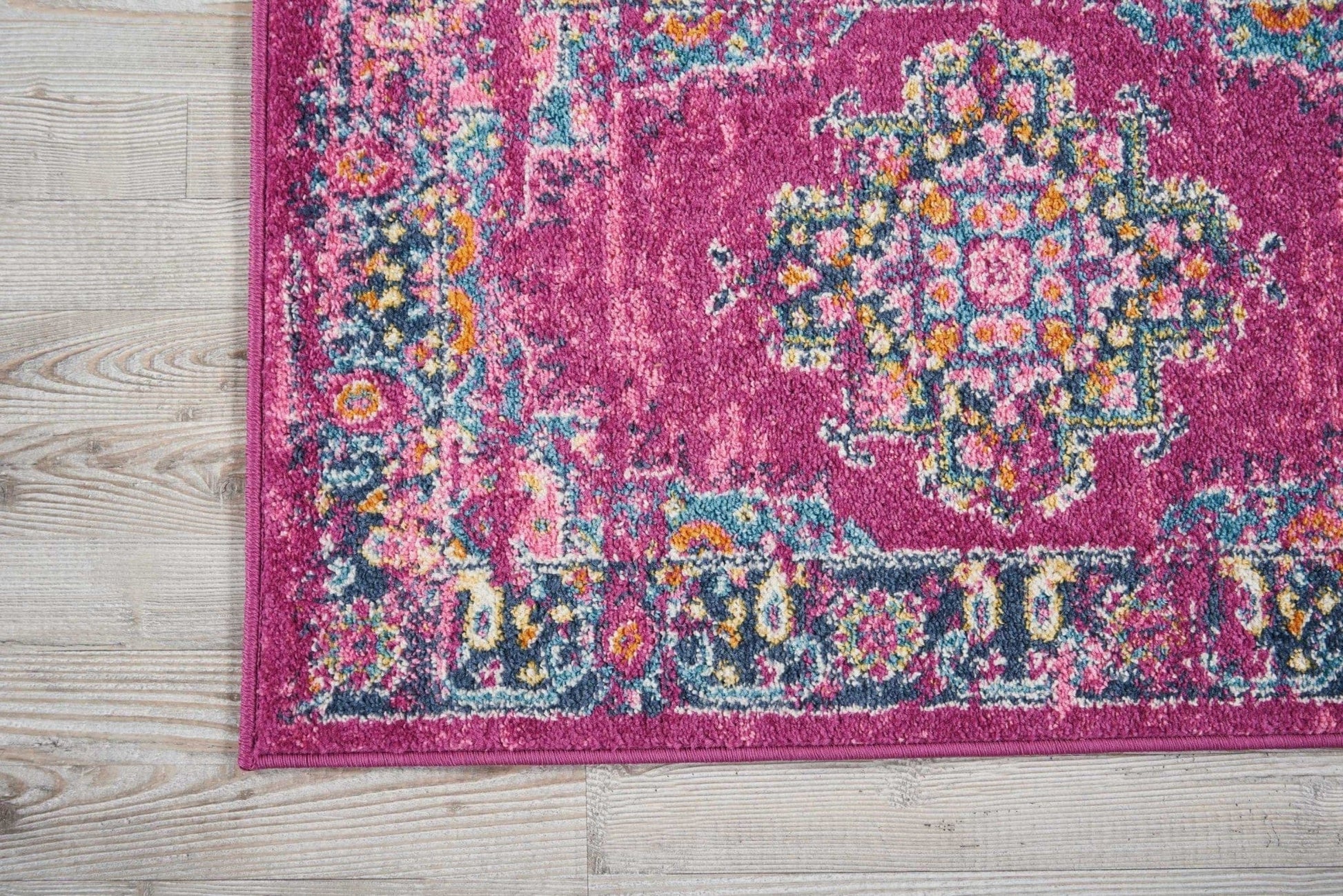 Emanating a rich traditional appeal with a modern flair, this Fuchsia and Blue Distressed Runner Rug accentuates the Persian artistry to stand out in any transitional setting. Adorned with an intricate floral medallion in the center featuring pops of blue, orange, and green resembling a flower bouquet, while the richly decorative border blends in harmony over the distressed deep fuchsia background. Made to stand the test of time, this rug is crafted in Turkey with 100% polypropylene to ensure stain resistance and easy maintenance. This soft-cut-pile build and advanced power-loomed construction provide a smooth surface texture for unparalleled comfort in indoor areas with medium foot traffic. Showcasing a vibrant color palette with a distressed effect, this captivating runner rug stays true to your traditional love while upholding a modern grace. 2'2" x 10'