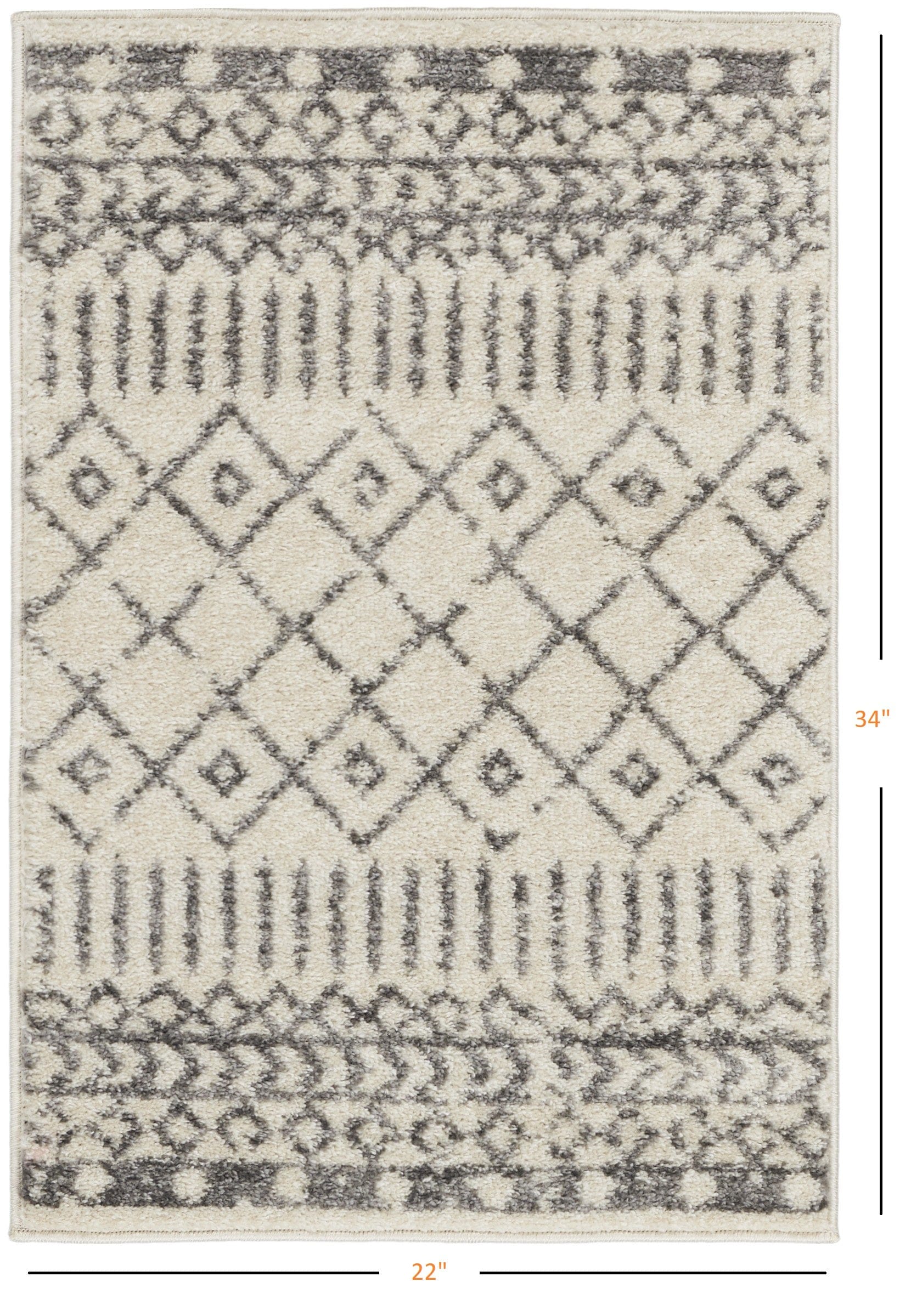 Hosting intricate Scandinavian geometric patterns in a tasteful modern color palette, this Ivory and Gray Geometric Scatter Rug is made to bring your traditional styling into the modern era. The bold gray linework is given a distressed coating while the soft finish ivory base makes it look comforting and welcoming. Skilfully crafted in Turkey with 100% polypropylene to ensure durability, stain resistance, and easy cleaning which makes this rug a great add-on to contemporary, transitional, and bohemian indoor living spaces. The soft power-loomed build ensures low shedding and comfort with every step. Pay homage to Scandinavian design while adding a Bohemian allure to your living area with this classic scatter rug. 1'10" x 2'10"