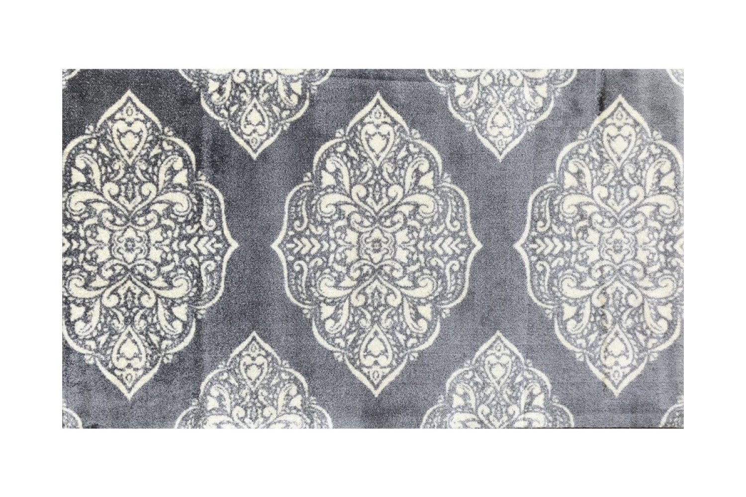 This low profile Gray and Ivory Scallop Medallion Washable Floor Mat is a game changer.A fade resistant, slightly distressed, medallion design with netural shades of silver, gray, and white provides a traditional and timeless look for a mat that is super sturdy and yet can easily be thrown into the washer and dryer to clean. The premier formula rubber backing used makes this nylon rug slip resistantr with no need for an additional pad, and the backing will hold up during the wash and dry! The low profile means it easily fits under doors. Combine fashion and style with real life functionality with this great area rug/door mat. 27.5" x 47" x .3"