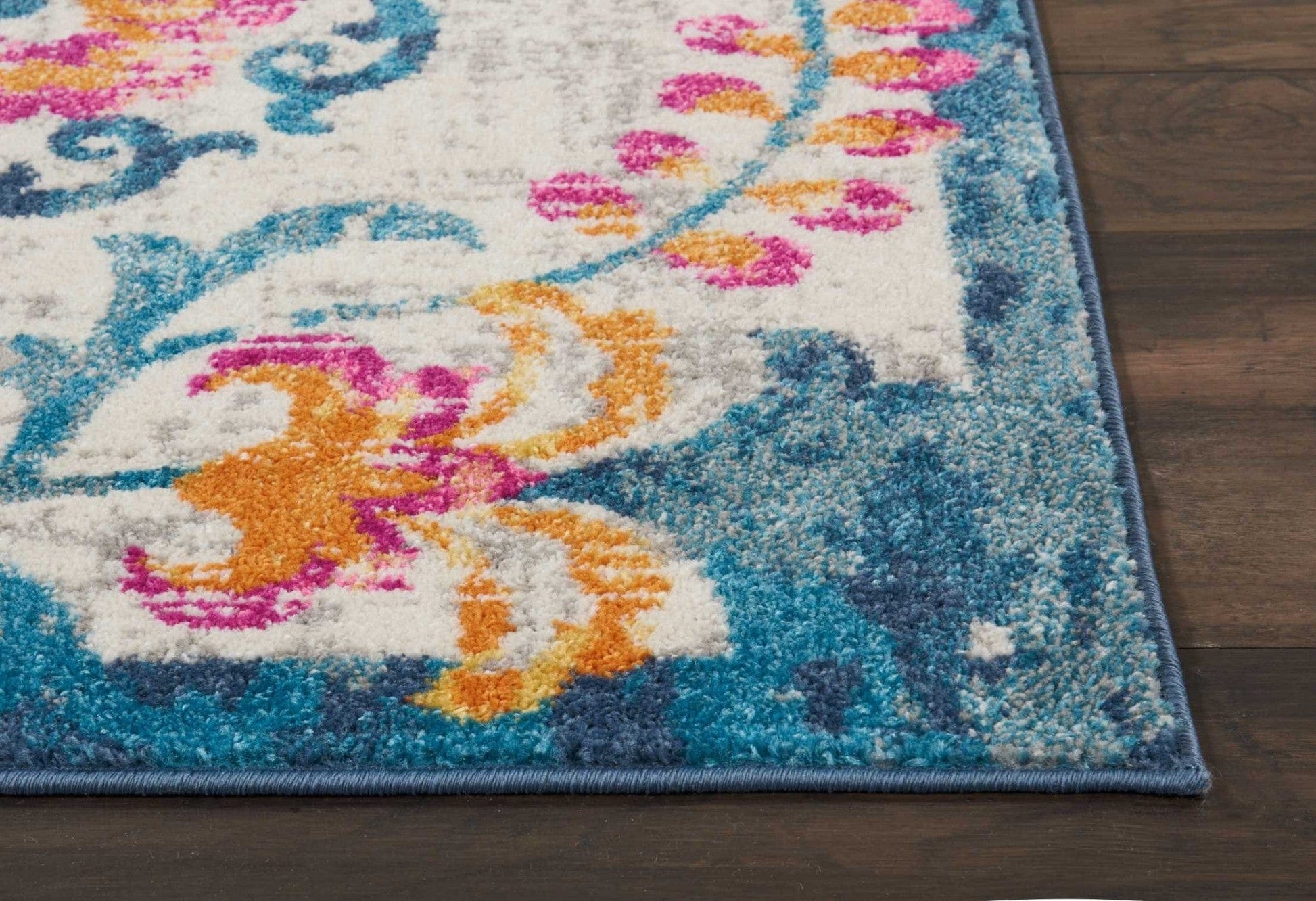 The tropical beauty of this Ivory and Blue Floral Vines Runner Rug boasts beautiful flower elements in a chic modern color scheme that brings traditional and contemporary decor into harmony. The bold oversized flowers and vines are uplifted with bright shades of orange and magenta resting on a soft-toned Ivory base and framed with deep blue borders. The masterful use of bright colors makes it ideal for modern, contemporary, bohemian, and traditional indoor styling. Made with 100% polypropylene to ensure enhanced durability, stain resistance, and easy maintenance. This exceptional rug feels as good as it looks due to the soft pile construction that is only possible with fine Turkish craftsmanship. Express your love for nature and vivacity with this beautiful runner rug that will tie the aesthetics of your home together. 1'10" x 6'