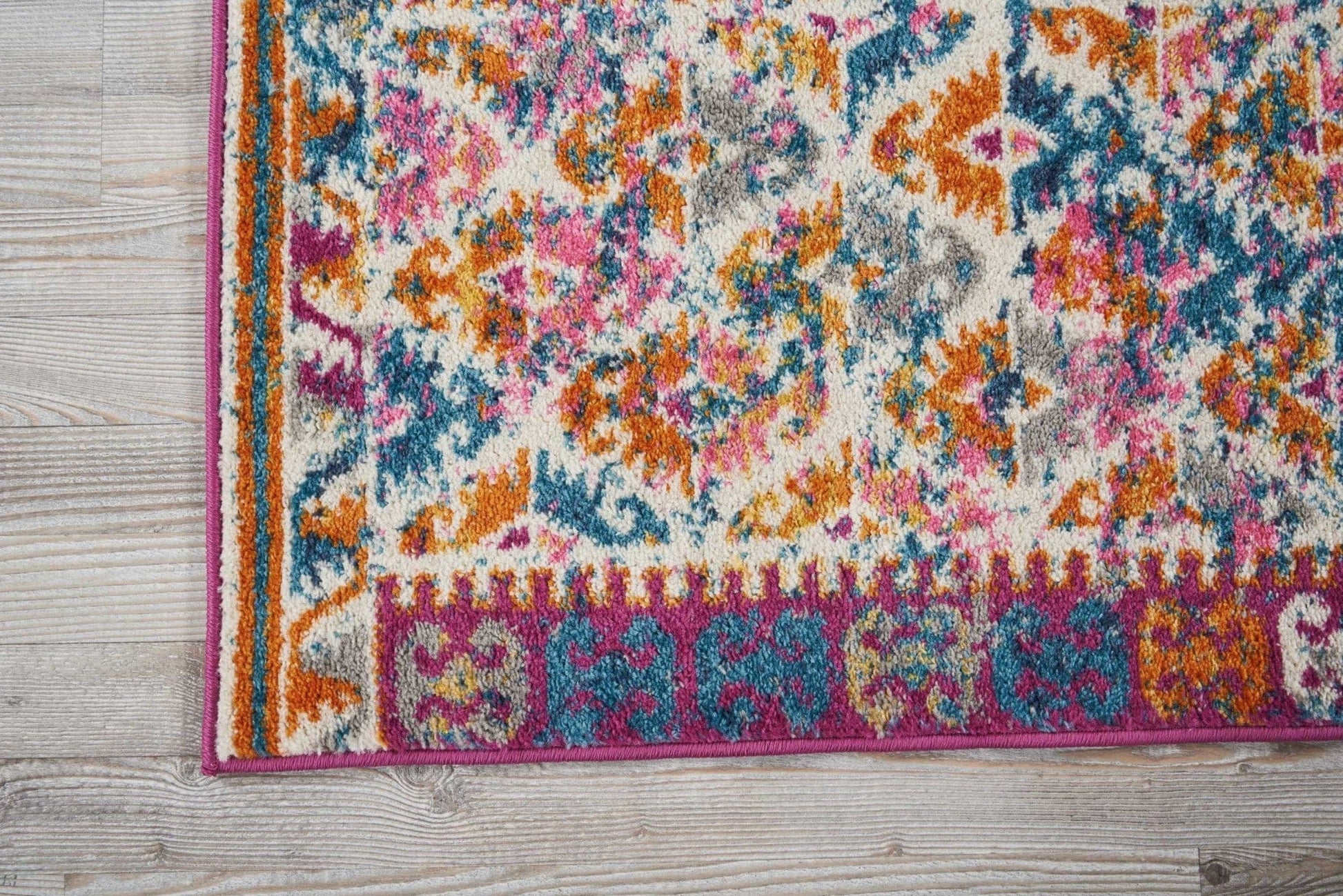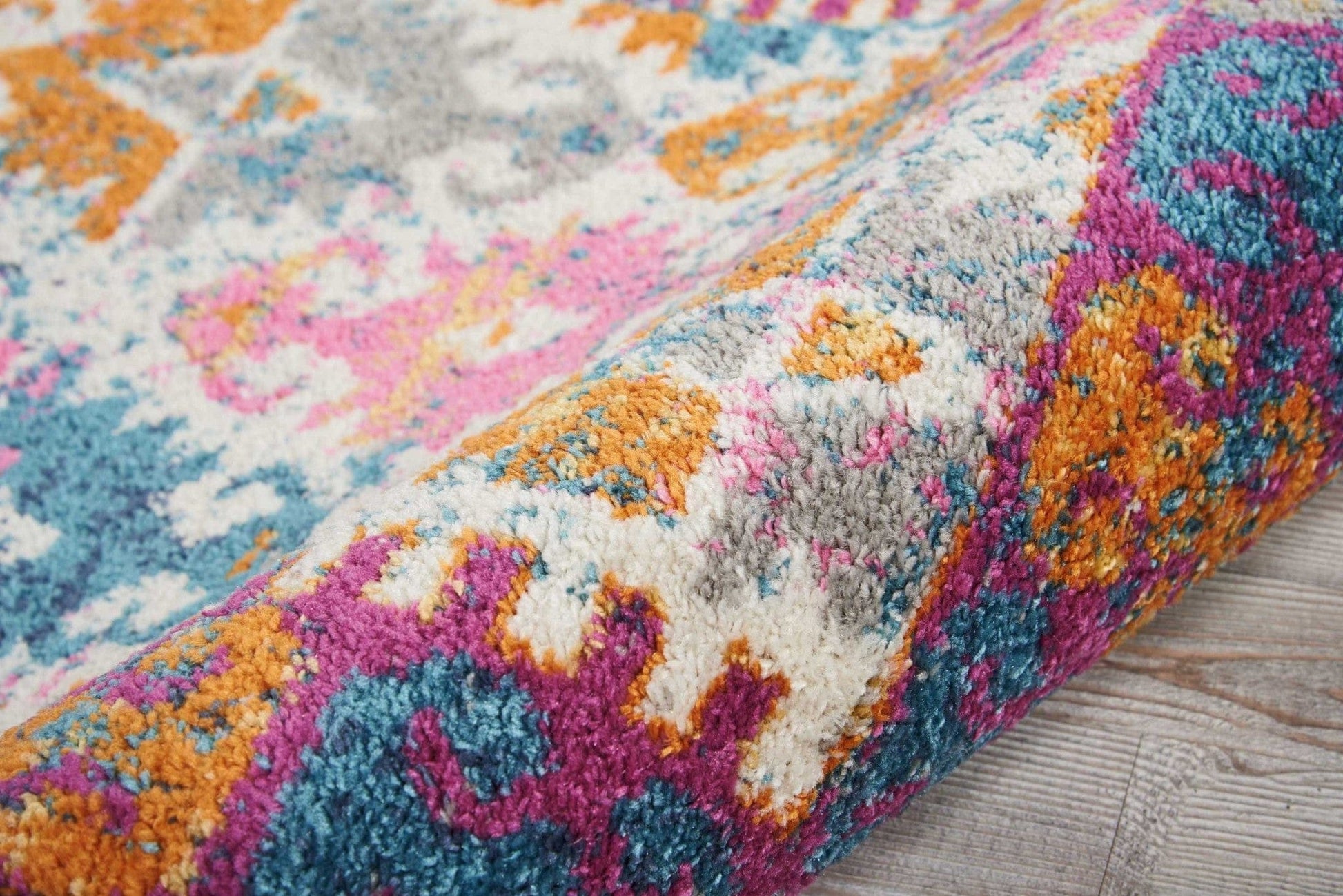 Express your affinity for tribal aesthetics and culture with this beautiful Ivory and Magenta Tribal Pattern Runner Rug that is both colorful and elegant. The unique tribal patterns come to life with its vibrant use of fuchsia, saffron, gold, and teal on ivory giving it versatility as a primary decorative piece. The strong borders and deep color scheme makes it suitable for traditional, contemporary, and bohemian setups. Made in Turkey, the brilliant print of this rug will last for ages due to the use of high-quality soft 100% polypropylene and advanced power loom construction. Besides being easy to care and maintain, this rug is considerably stain-resistant to stand up to the messes and scratches of indoor areas with medium foot traffic. The saturated hues and traditional patterns of this runner rug will induce an adventurous and culturally progressive atmosphere in your living space. 1'10" x 6'