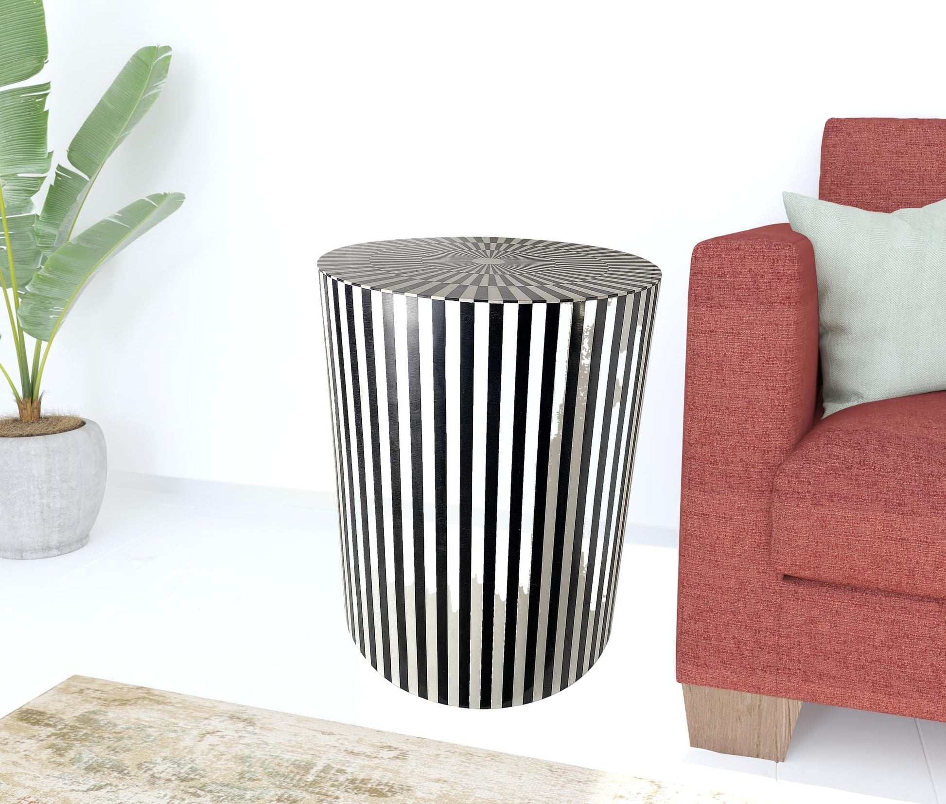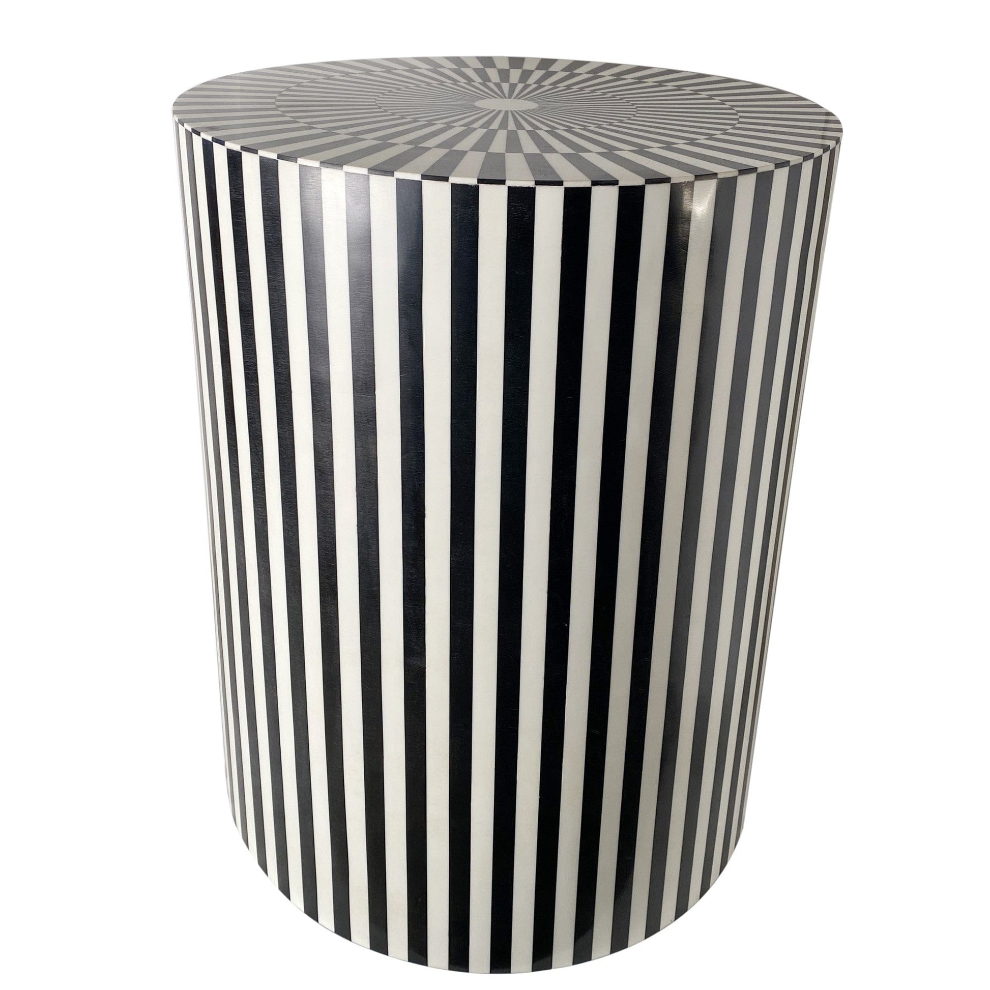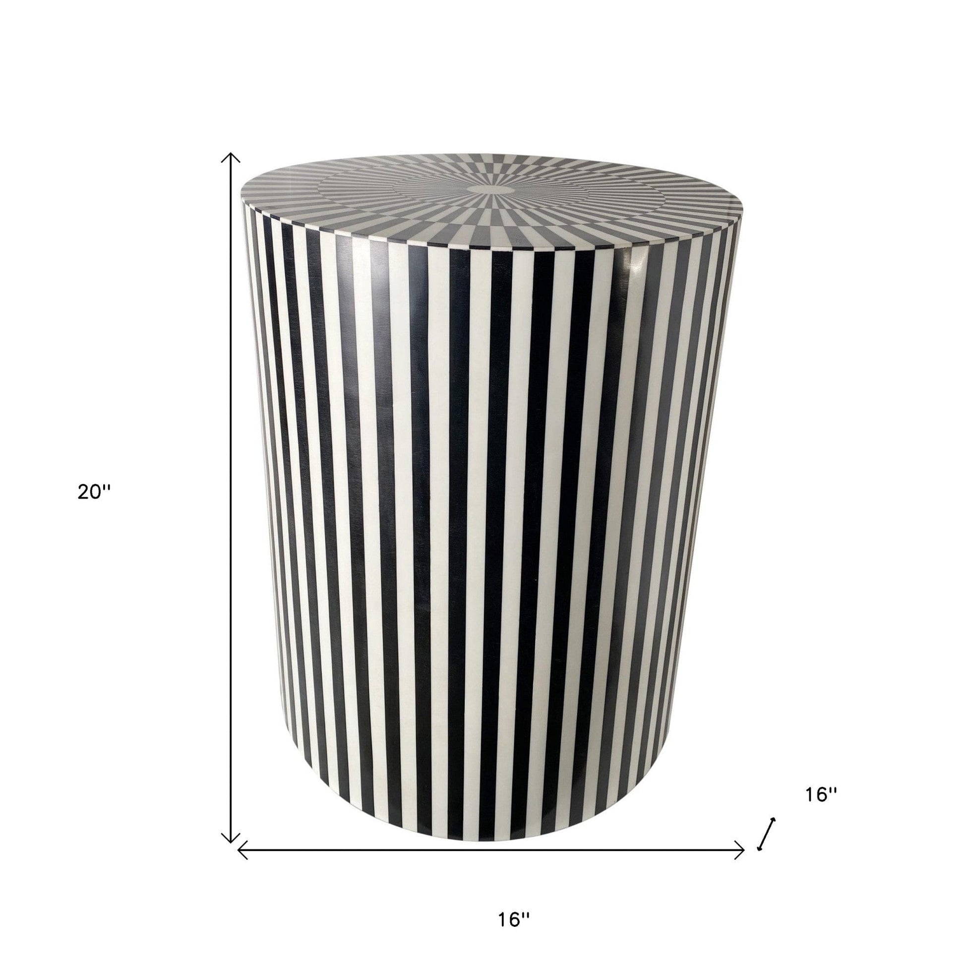 Show off your exquisite taste with this 20" mod black and ivory resin round end table. The fun black and ivory stripe design is very modern and chic. A great accent on either side of the sofa or bed, this adorable end or side table is just what you need. You can also use it as an entryway table to hold your keys or even as a stool or ottoman. 20" H x 16" W x 16" D