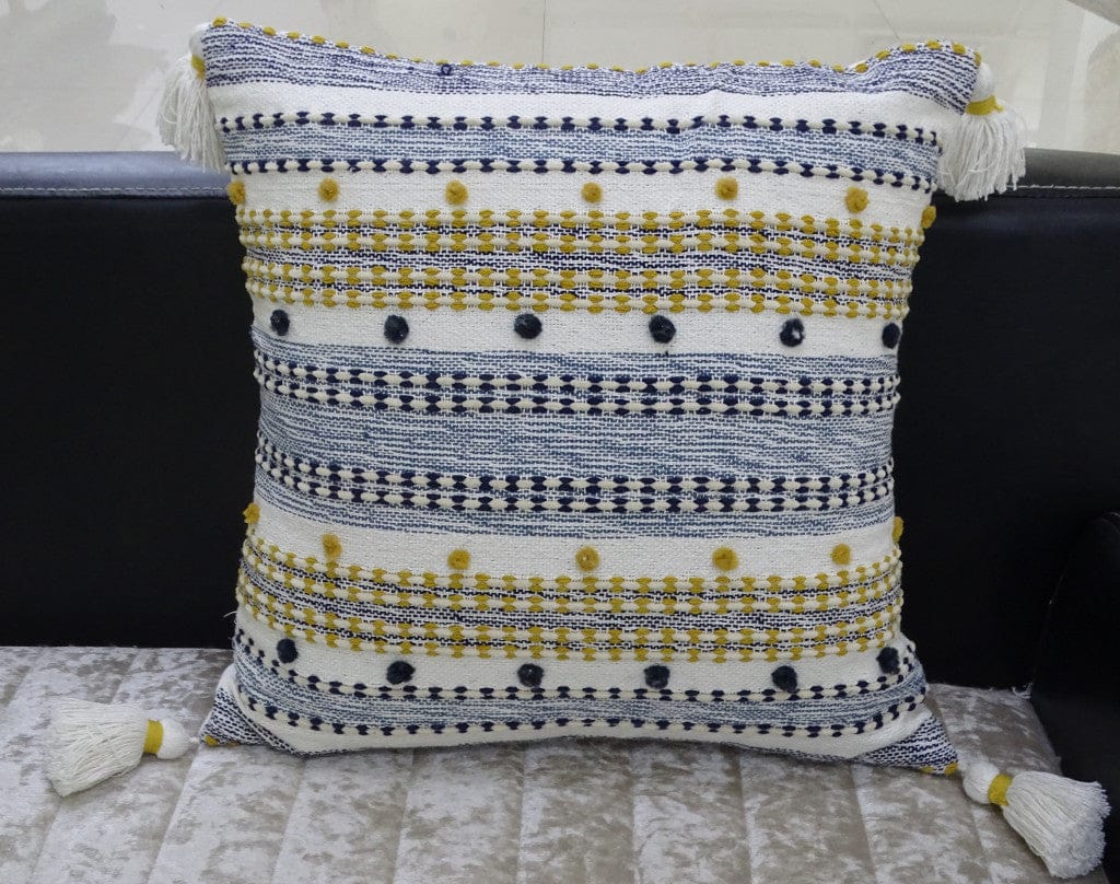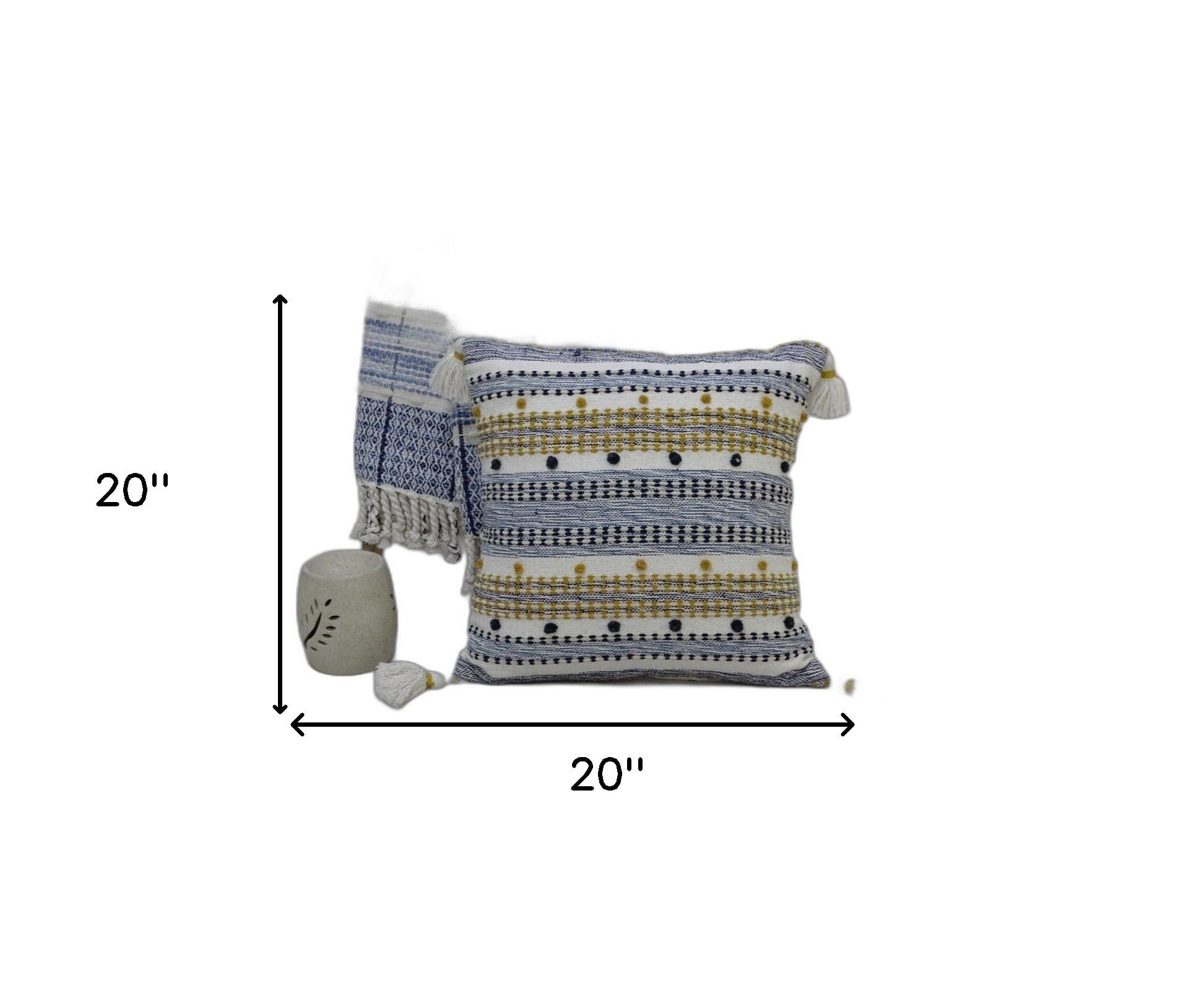 This 20" x 20" blue and yellow striped zippered handmade cotton blend throw pillow with tassels will add a beautiful decorative accent to your decor. Fun and decorative tassels add some high end and hand-crafted textural designer touches. Great to use on its own or mix with other decorations for the perfect look. Decorative pillows are a great way to change up the look and feel of your space easily and quickly. 10" H x 20" W x 20" D