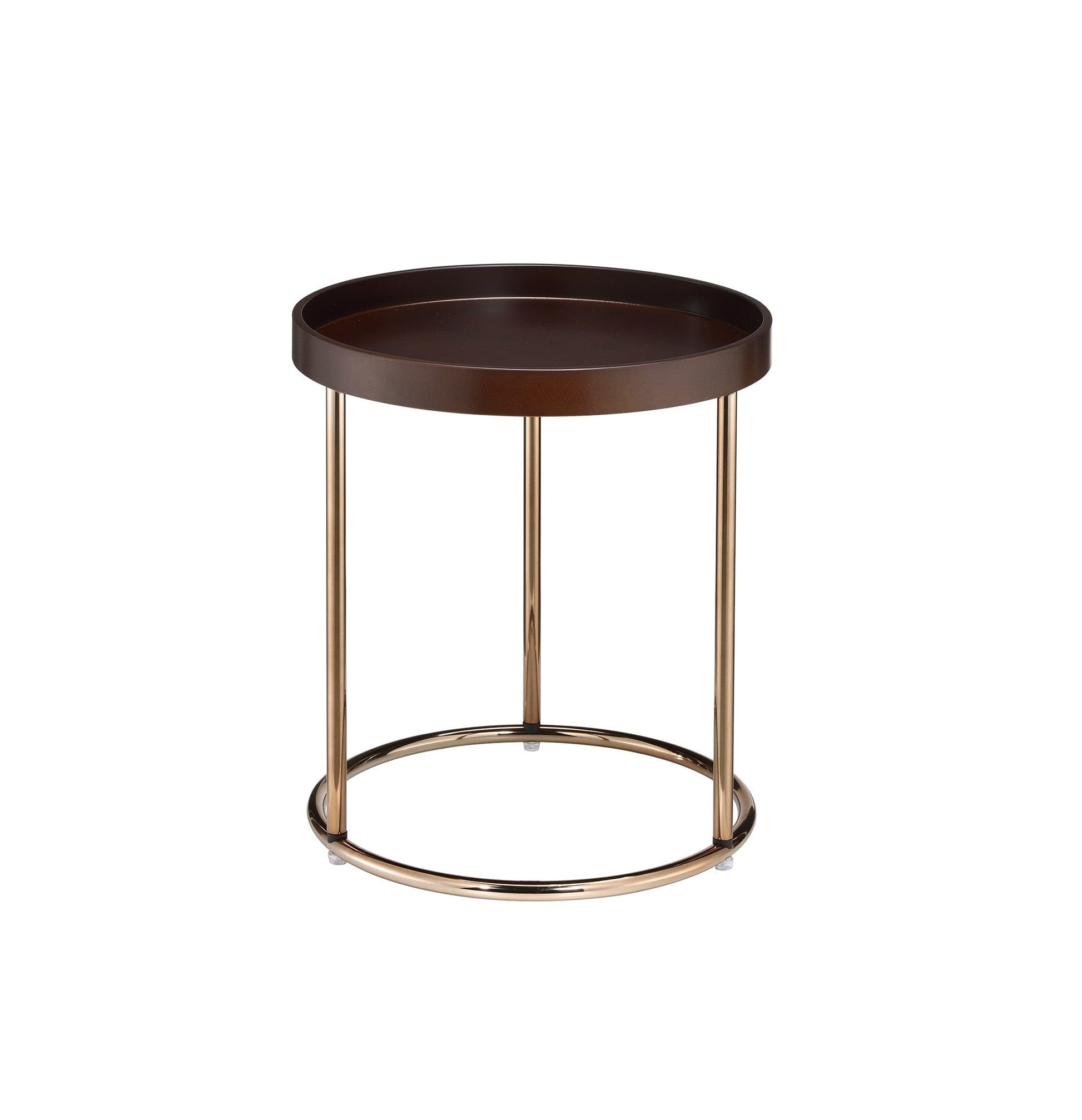 Optimize your space and add some charm to your room with the 22" copper and brown solid wood and steel round end table. The copper coloration of the high quality steel base marries nicely with the brown solid wood top. The lip around the tabletop edge is great for keeping everything neat and tidy. A great accent on either side of the sofa or bed, this adorable end or side table is just what you need. You can match it with other pieces to get the ideal look for your place. 21.75" H x 18.5" W x 18.5" D