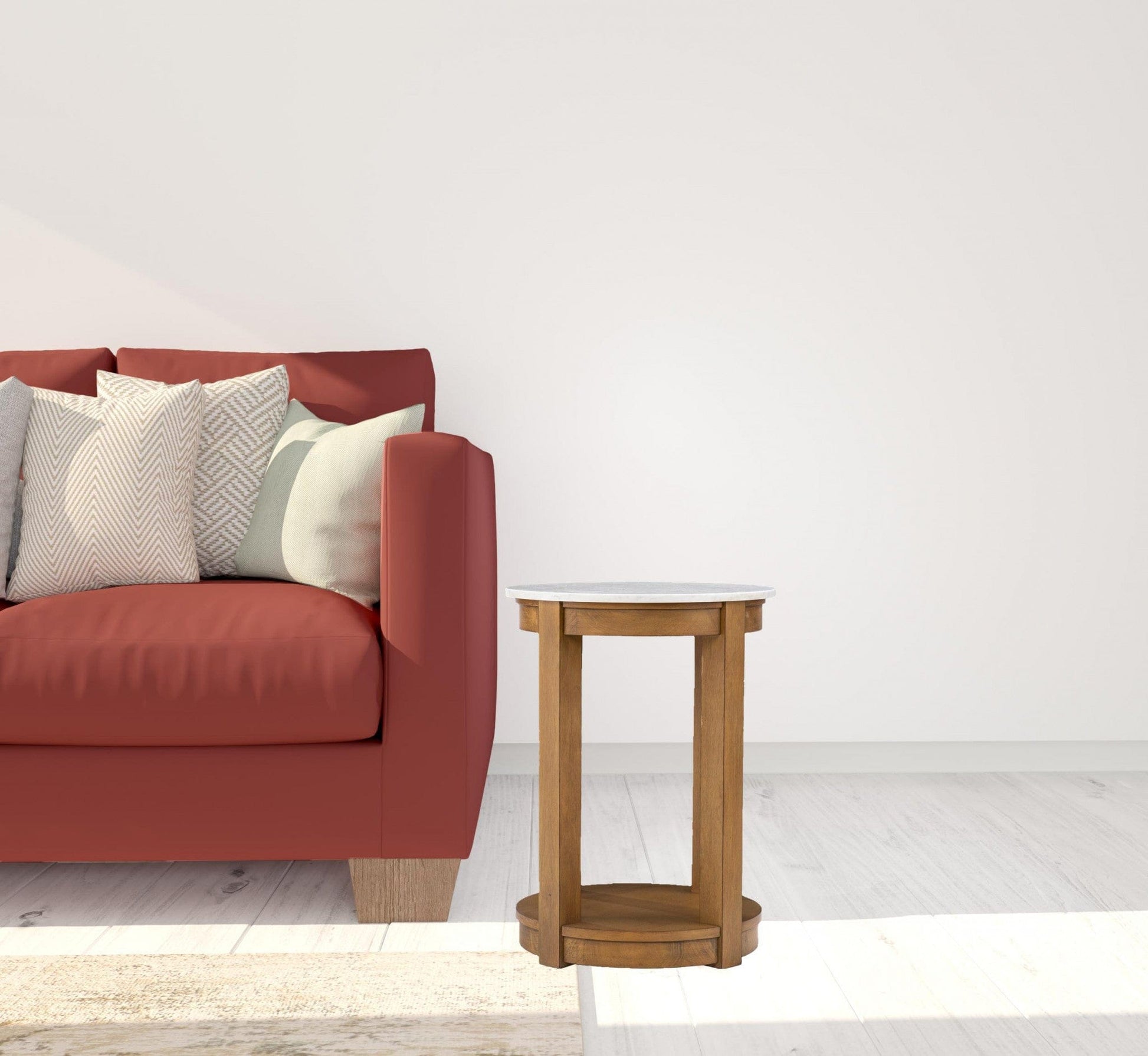 Distinctive in style, the 22" natural wood and white faux marble manufactured wood round end table with shelf radiates a versatile charm. This accent or side table is a high quality piece, expertly made of high grade manufactured wood. Help to keep your space organized with the included single shelf. An ideal location for placing your snacks and drinks, and a place to keep your lamp, frames, or other accessories. You can also use it as an entryway table to hold your keys. 22" H x 16" W x 16" D