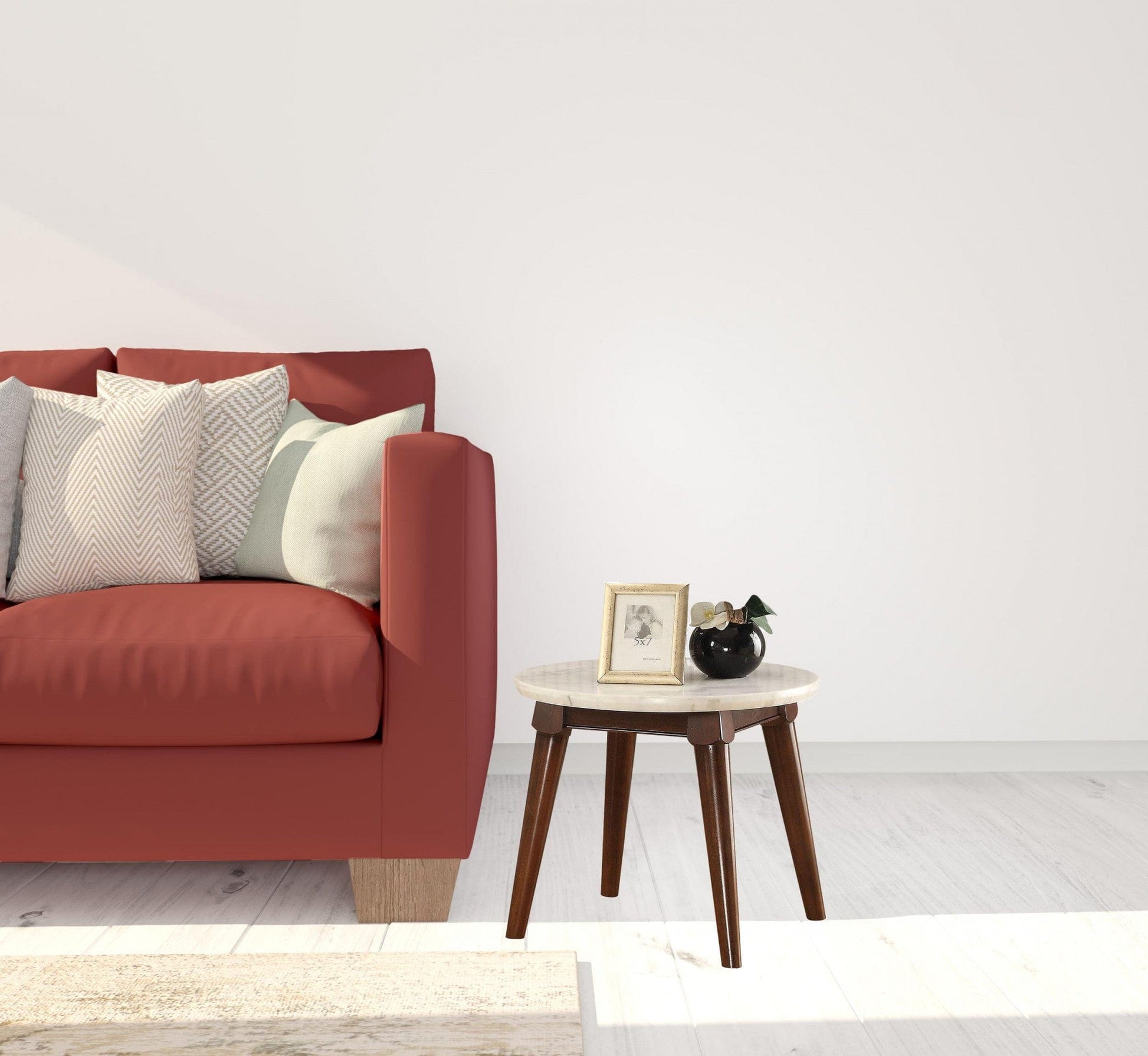 Show off your exquisite taste with this 22" walnut and white faux marble round end table. The walnut coloration of the high quality manufactured wood base marries nicely with the white faux marble top. An ideal location for placing your snacks and drinks, and a place to keep your lamp, frames, or other accessories. This versatile and modern looking table is a great accent for most any room. 22" H x 24" W x 24" D