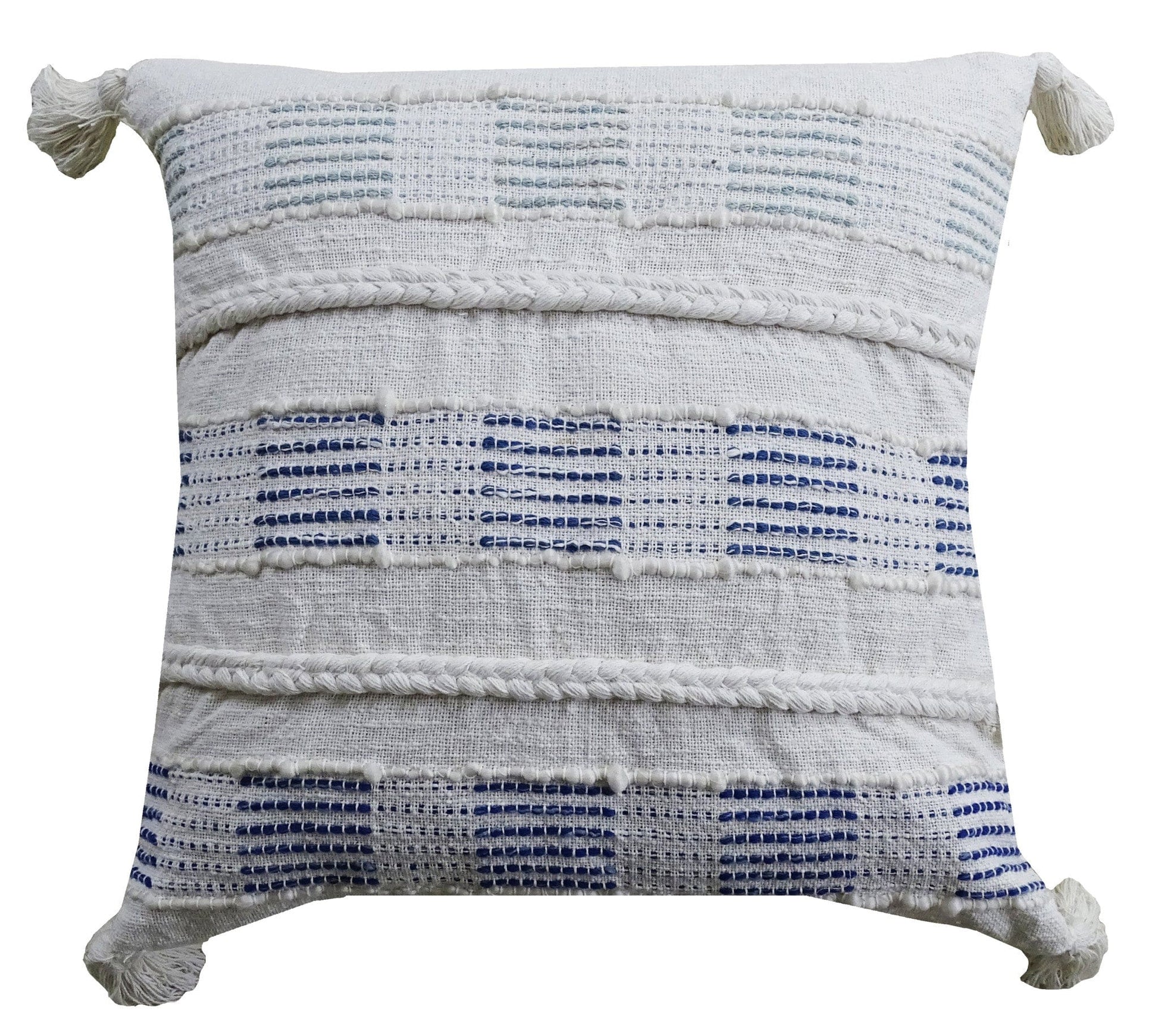 The 22" x 22" off white and blue checkered zippered handmade cotton blend throw pillow with tassels is the perfect decorative accessory for your home. Charming decorative tassels give this design texture along with a hand-crafted look and feel. Great to use on its own or mix with other decorations for the perfect look. Decorative pillows are a great way to change up the look and feel of your space easily and quickly. 10" H x 22" W x 22" D