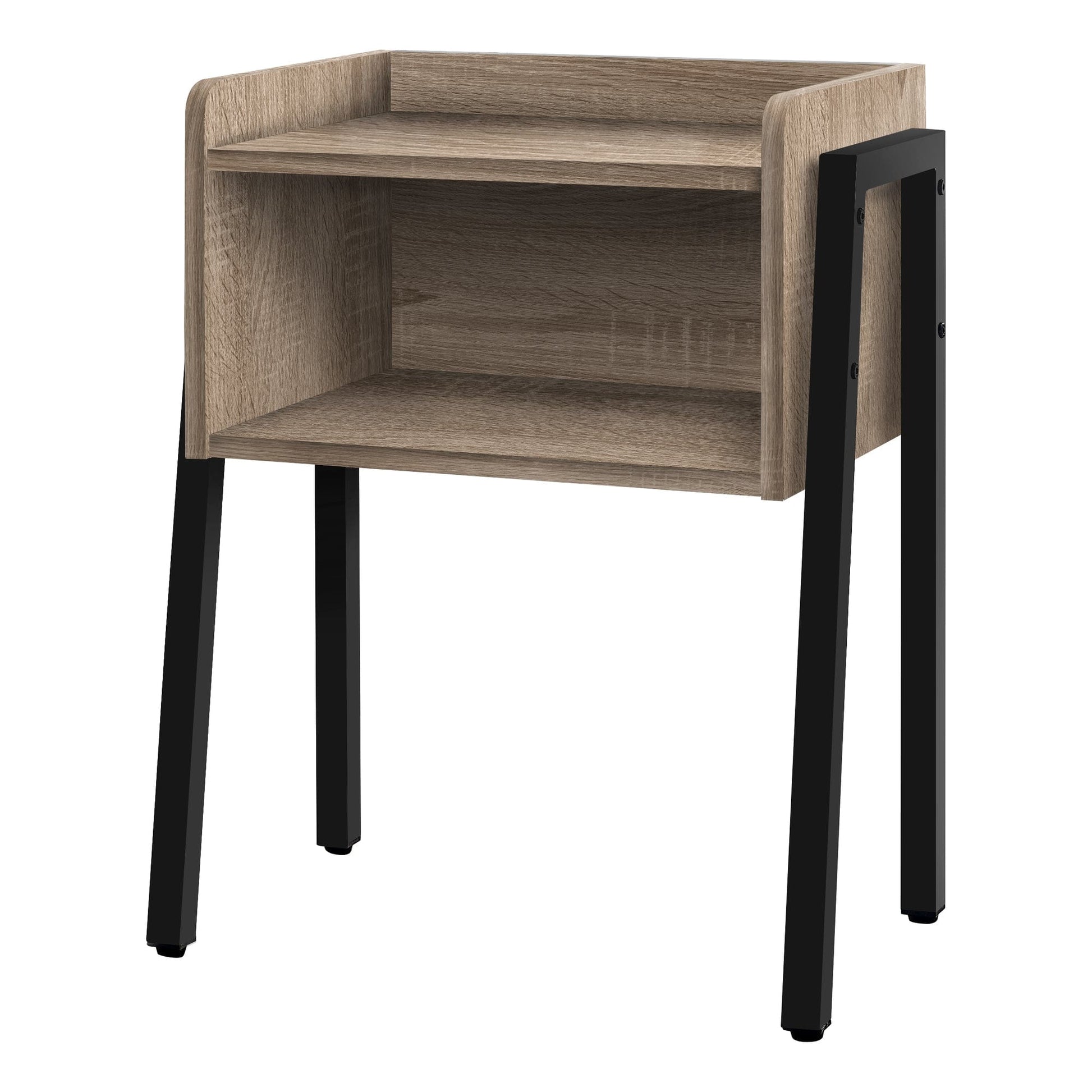 Save space while providing the perfect sidekick to any furniture ensemble. This end table, featuring a reclaimed look finish in dark taupe, is equipped with an open shelf and modern black metal legs to complete the industrial-inspired design. Made for showing off your favorite decor items or storing books in the living room or family room, this side table can also be used as a bedside table. It is an on-trend piece that is waiting to be added to any living space. Assembly is required.
