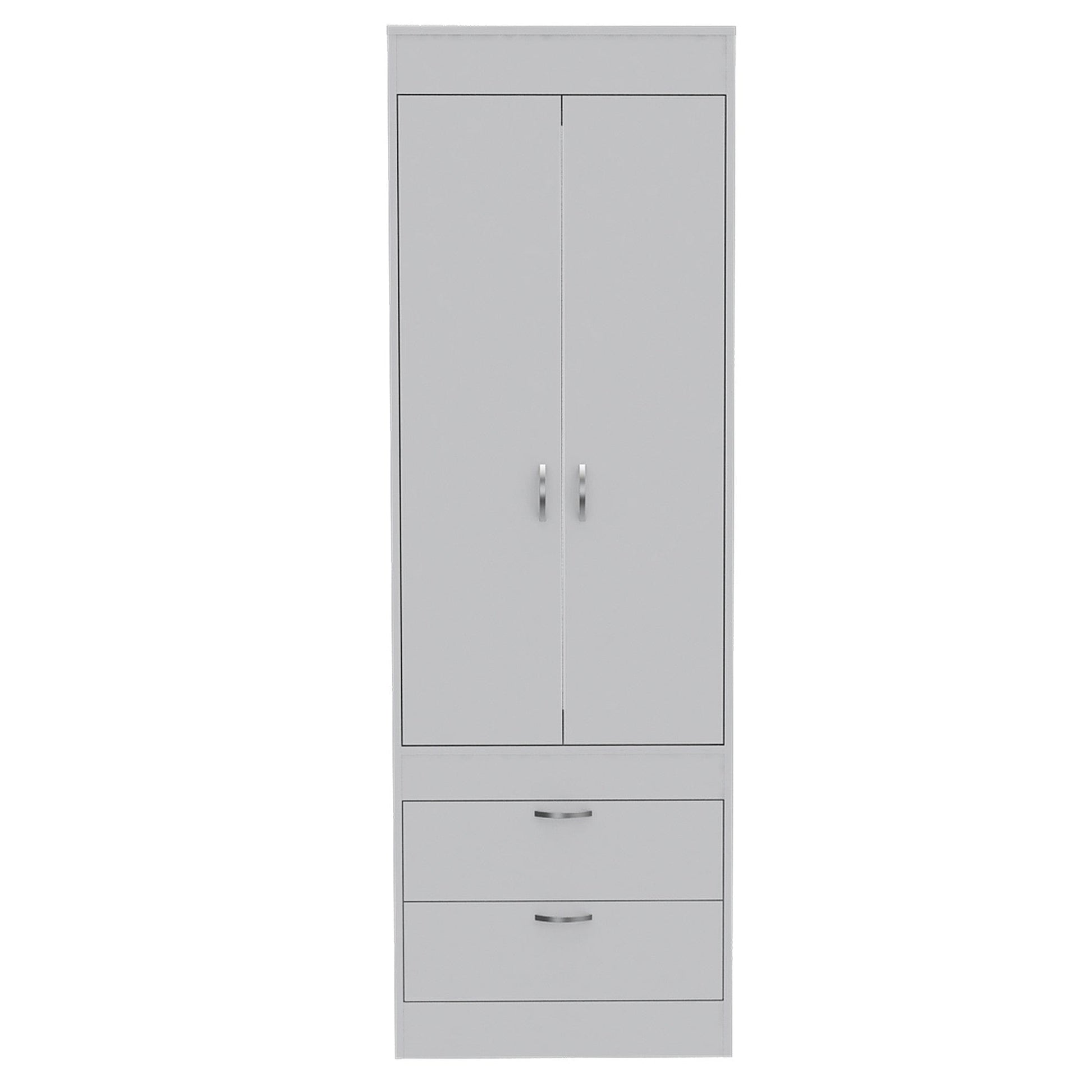 This 23" white manufactured wood two drawer combo dresser is a practical and good looking accent for your bedroom storage and organizational needs. Versatile in use, this combo dresser is equipped with both drawers and doors for all your storage needs. Its a high quality piece, made from high grade manufactured wood. The white coloration of this piece is neutral and will blend easily with most any decor. 70.4" H x 23.3" W x 18.8" D
