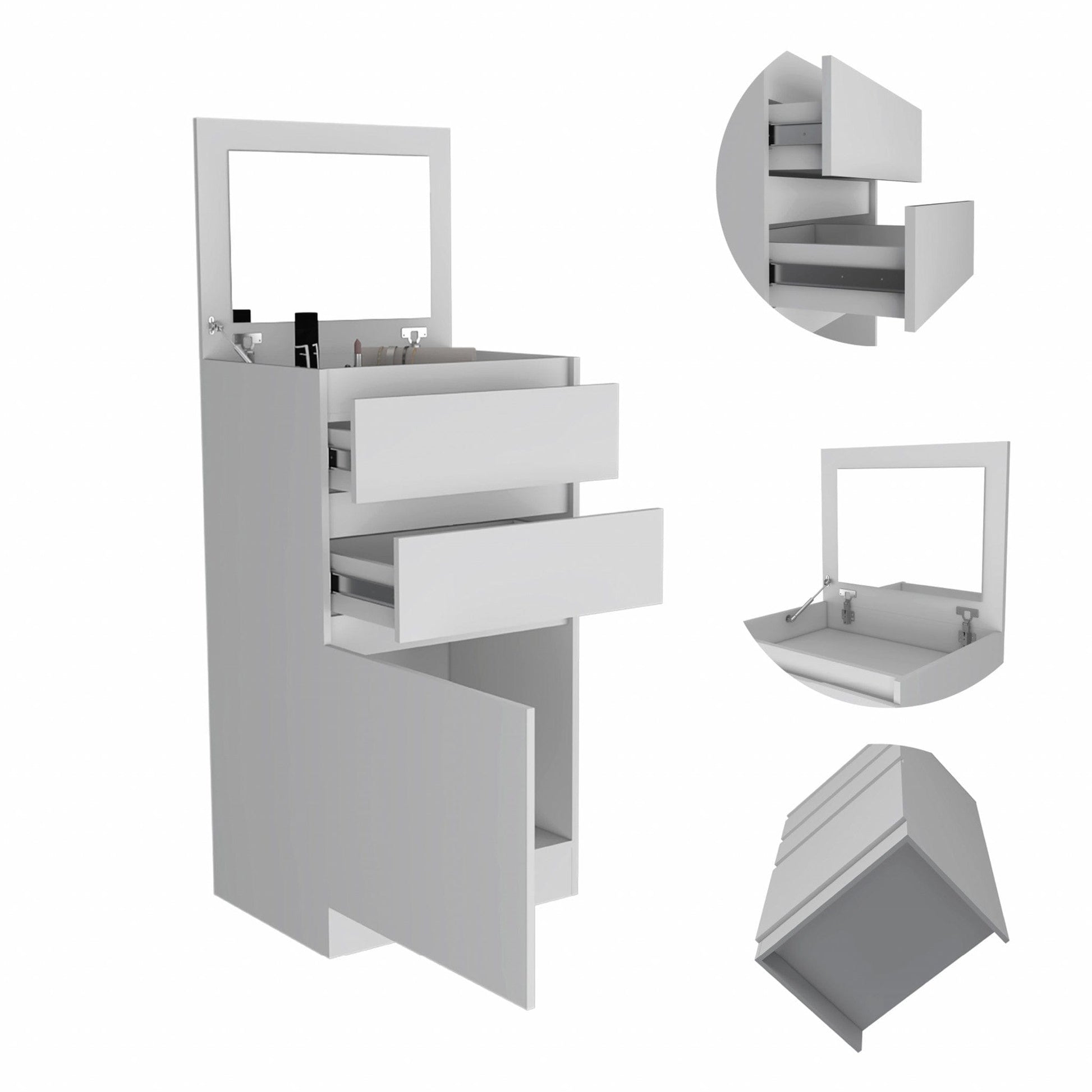 Add personality to your bedroom style and a feeling of coziness with this 23" white manufactured wood two drawer vanity chest. This chest of drawers is tall and lean making it an ideal choice for smaller rooms or as an additional storage option in larger rooms. This fabulous piece is so unique it includes a mirror and jewelry box in a sleek modern fashion. Its a high quality piece, made from high grade manufactured wood. The white coloration of this piece is neutral and will blend easily with most any decor. 43.6" H x 23.3" W x 18.3" D