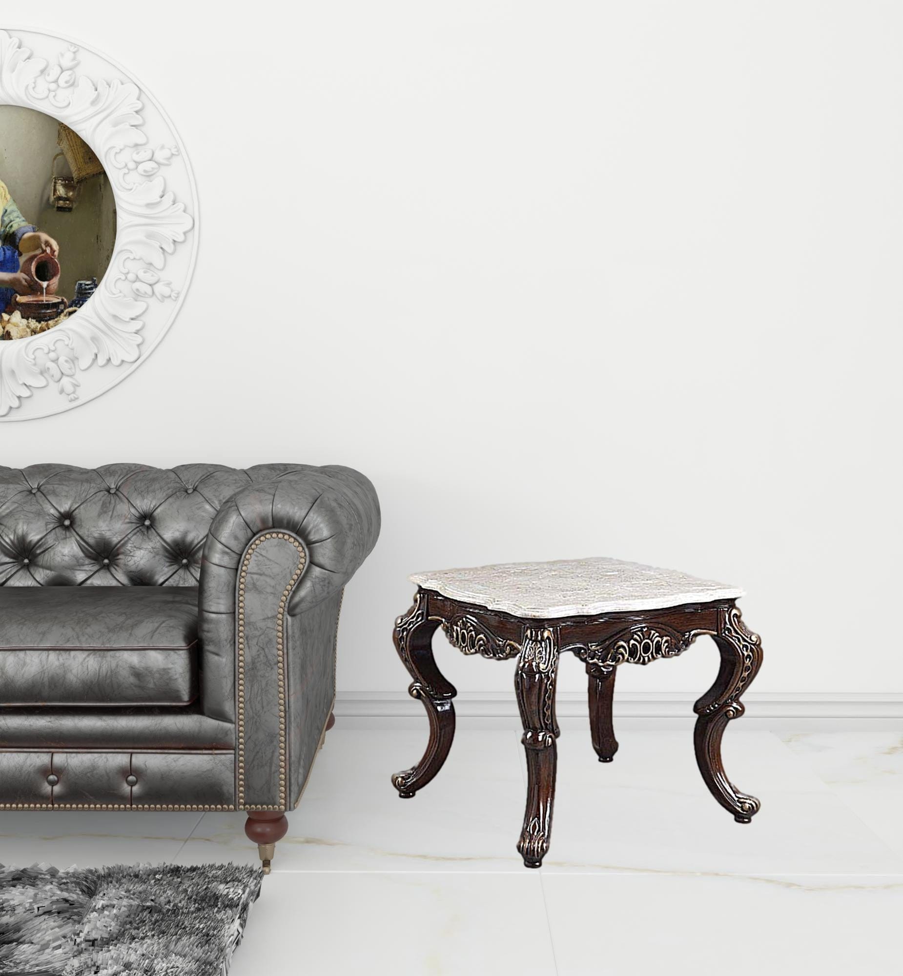 Show off your exquisite taste with this 24" antique oak and marble marble and resin square end table. The marble marble top of this table is a nice contrast to the high quality, antique oak resin of the base. Side tables are a great way to flank your sofa, use as an accent next to your favorite chair, or can even be used bedside. You can match it with other pieces to get the ideal look for your place. 24" H x 28" W x 28" D