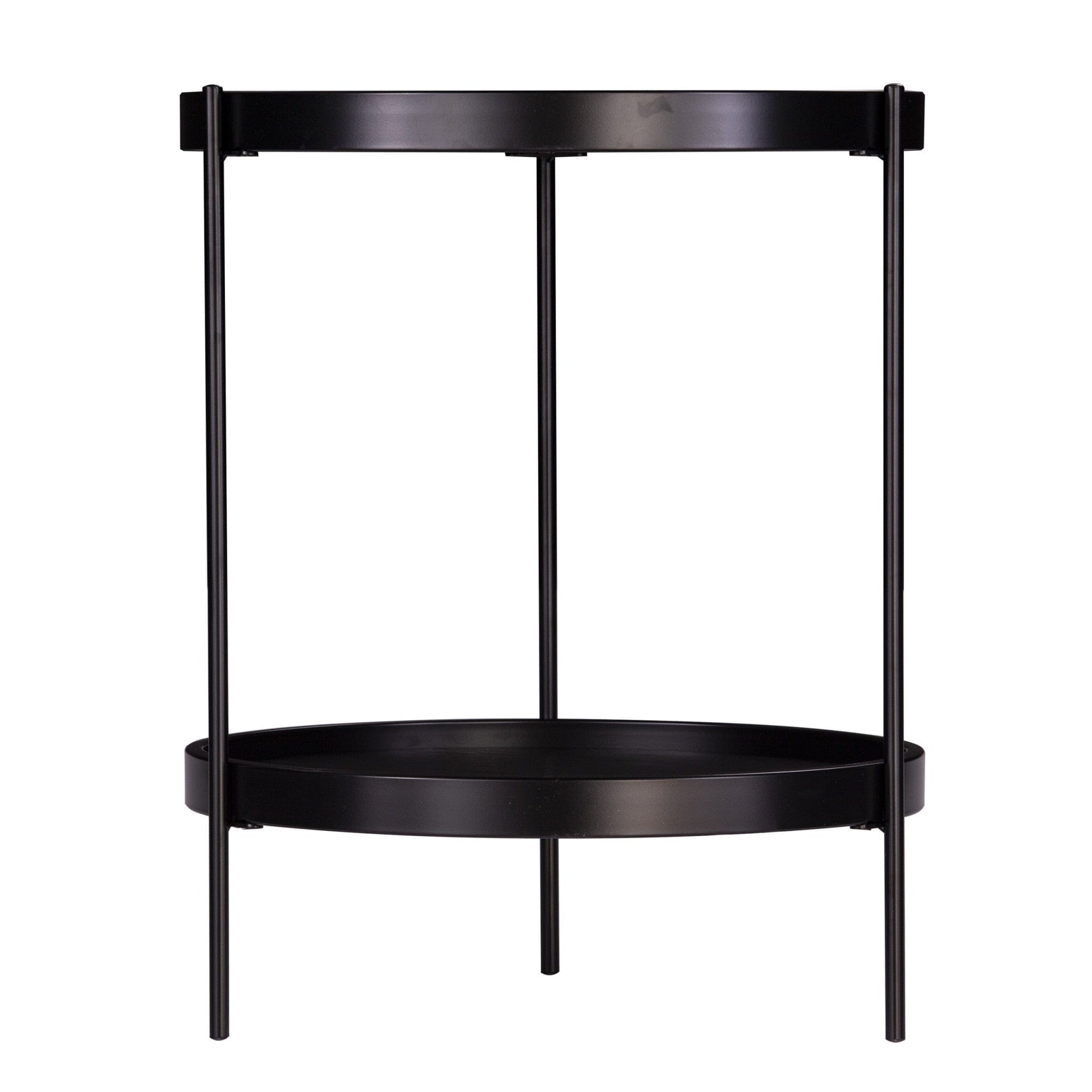 Optimize your space and add some charm to your room with the 24" black manufactured wood and iron round end table with shelf. Artfully crafted of metal, this beautiful design is chock-full of fine details. A sleek black monotone color gives this iron and manufactured wood table a fresh and updated look. Help to keep your space organized with the included single shelf. A great accent on either side of the sofa or bed, this adorable end or side table is just what you need. You can match it with other pieces to get the ideal look for your place. 24" H x 19.75" W x 19.25" D