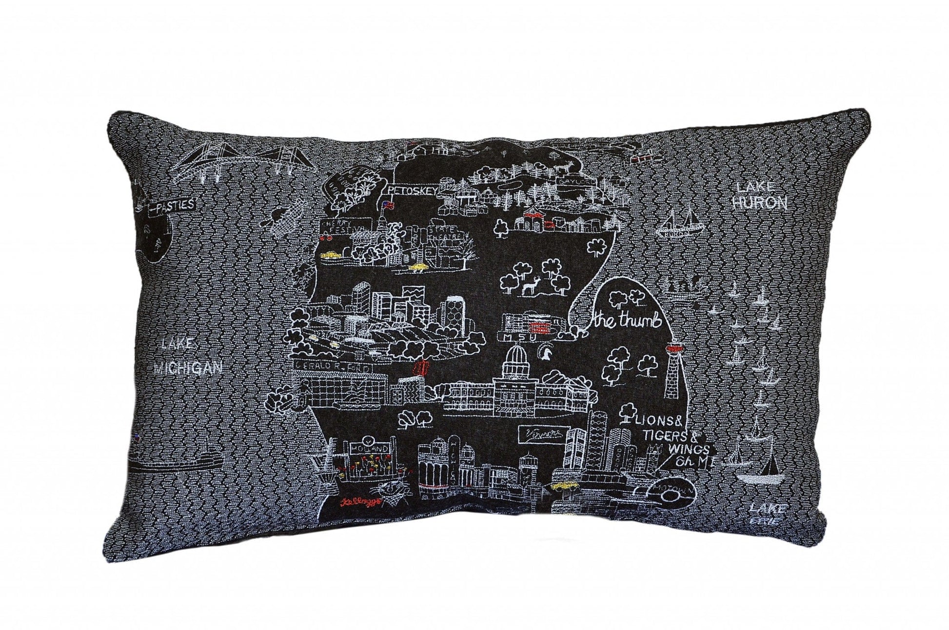 Showcase one of the greatest and most beloved states, with our Black Color Michigan Lower Peninsula Nighttime Skyline Prince Size Lumbar Decorative Pillow. This Nighttime view of the wonderful mitten and Upper Peninsula surrounded by their famous lakes is a stunning way to represent this great state. The gorgeous art features famous references and landmarks rendering a modern whimsical way to bring this iconic state to life. Made of a wool/nylon blend, this high quality stitched decorative pillow features white on black embroidered artwork mixed with pops of color that highlight important and recognizable icons from this fabulous city. This pillow makes a great gift, decorative accent and conversation piece. 4" x 24" x 14"