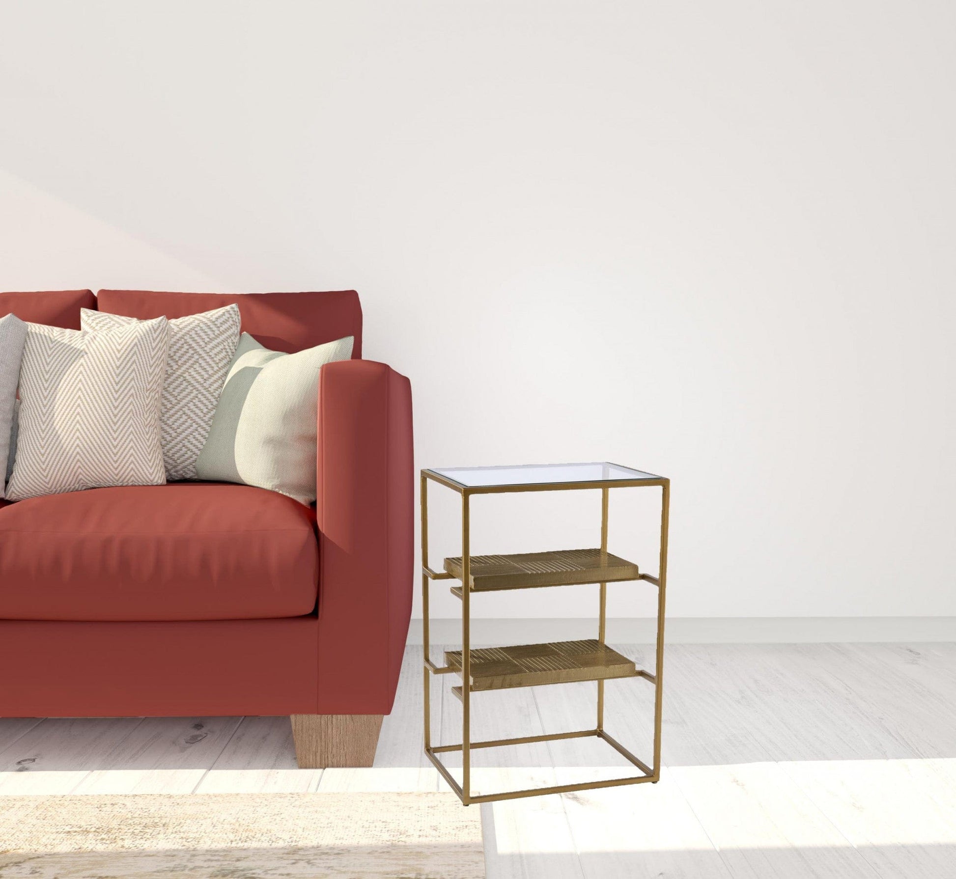 Optimize your space and add some charm to your room with the 24" brass glass and iron rectangular end table with two shelves. This marvelous end or side table is made from high quality metal. A sleek brass monotone color gives this iron and glass table a fresh and updated look. There are two shelves that will help to keep clutter at bay. A great accent on either side of the sofa or bed, this adorable end or side table is just what you need. You can also use it as an entryway table to hold your keys. 23.5" H x 15.75" W x 11.75" D