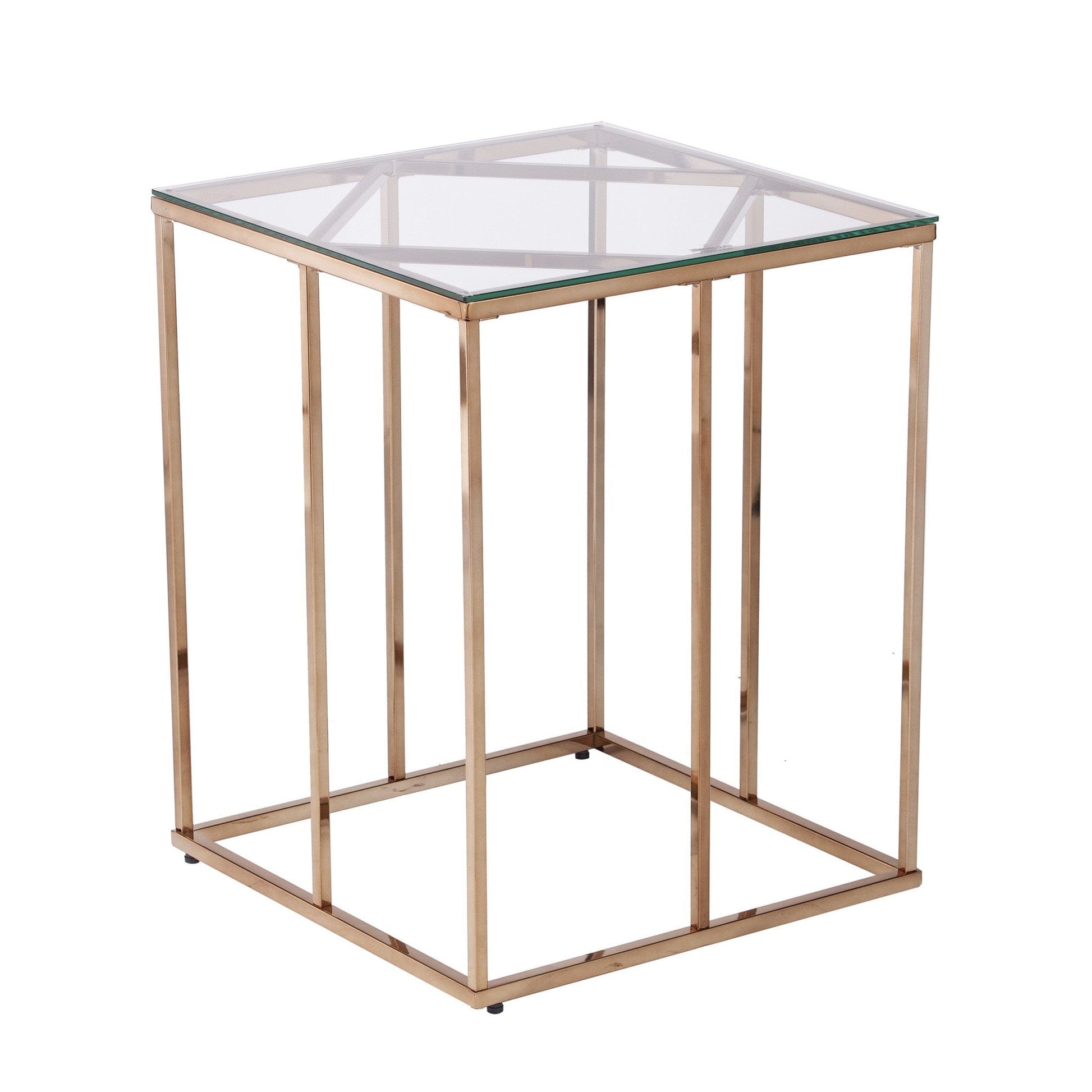 Optimize your space and add some charm to your room with the 24" champagne glass and iron square end table. This marvelous end or side table is made from high quality metal. A sleek champagne monotone color gives this iron and glass table a fresh and updated look. An ideal location for placing your snacks and drinks, and a place to keep your lamp, frames, or other accessories. This versatile table is a great accent for almost any room. 24" H x 19" W x 19" D