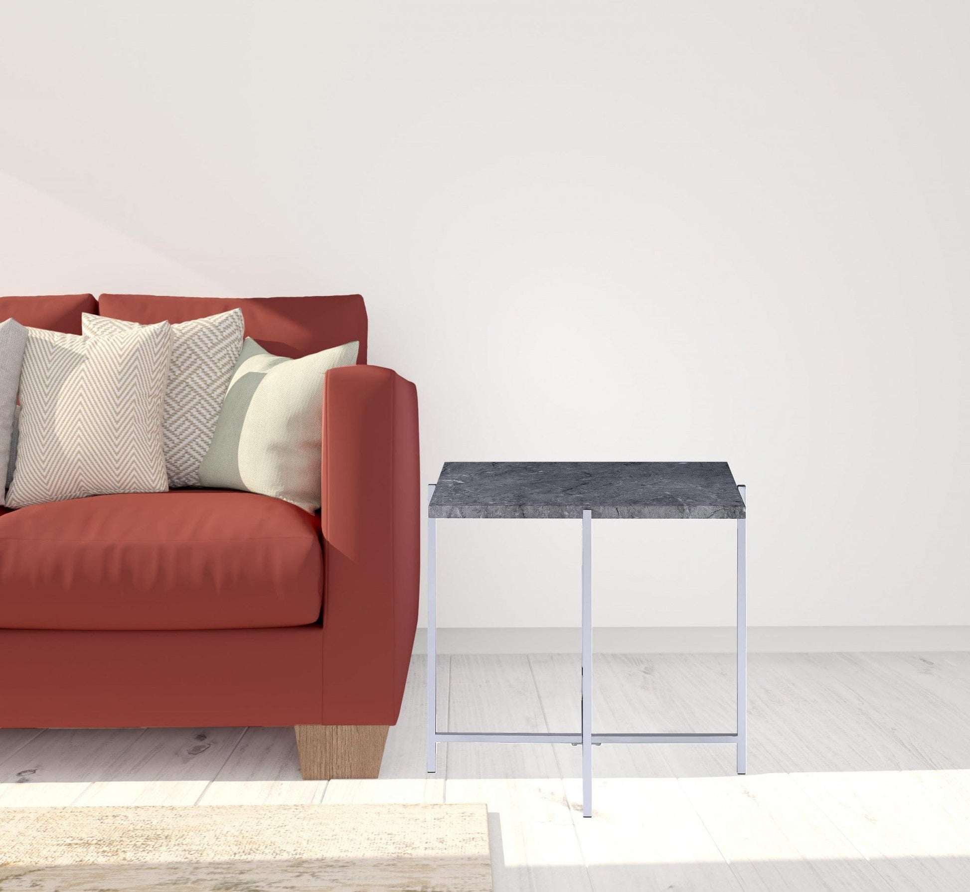 Distinctive in style, the 24" chrome and faux marble manufactured wood and metal rectangular end table radiates a versatile charm. Artfully crafted of manufactured wood, this beautiful design is chock-full of fine details. The chrome coloration of the high quality metal base marries nicely with the faux marble manufactured wood top. A great accent on either side of the sofa or bed, this adorable end or side table is just what you need. This versatile table is a great accent for almost any room. 24" H x 25" W x 20" D