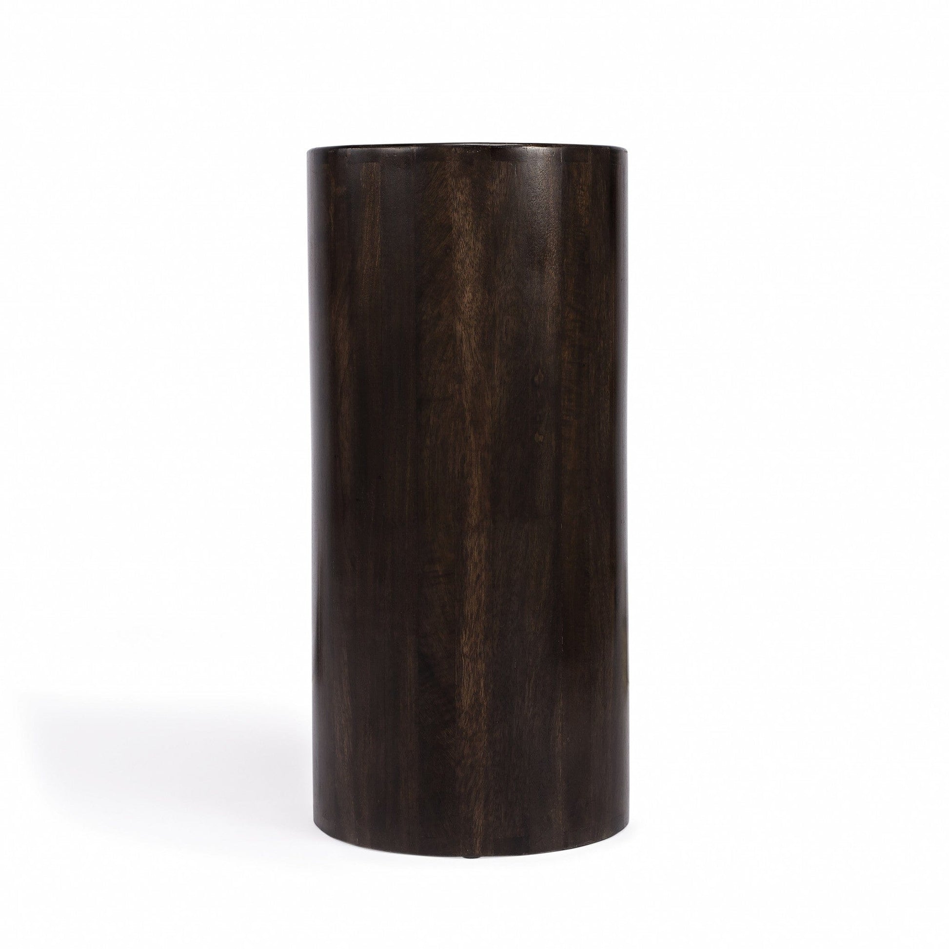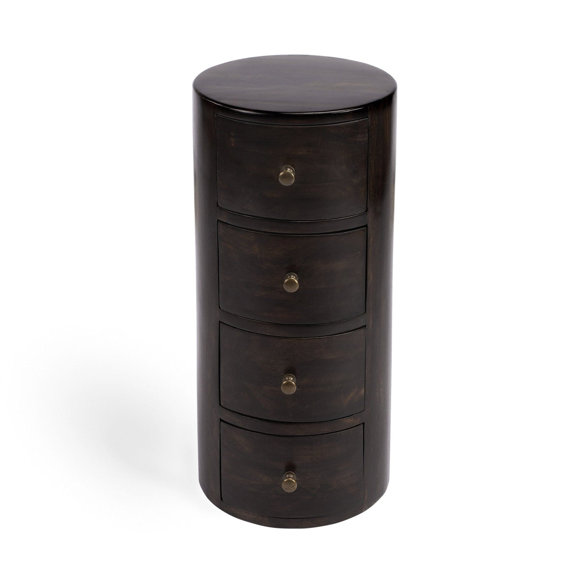 Distinctive in style the 24" dark brown chocolate wood round end table with four drawers radiates a versatile charm. A dark brown solid wood frame is the epitome of quality construction and design. Complete with a purposefully distressed finish, this table has an aged, vintage, and rustic feel. The unique pedestal column shape offers lots of hidden storage. Side tables are a great way to flank your sofa, use as an accent next to your favorite chair, or can even be used bedside. You can match it with other pieces to get the ideal look for your place. 23.5" H x 11" W x 11" D